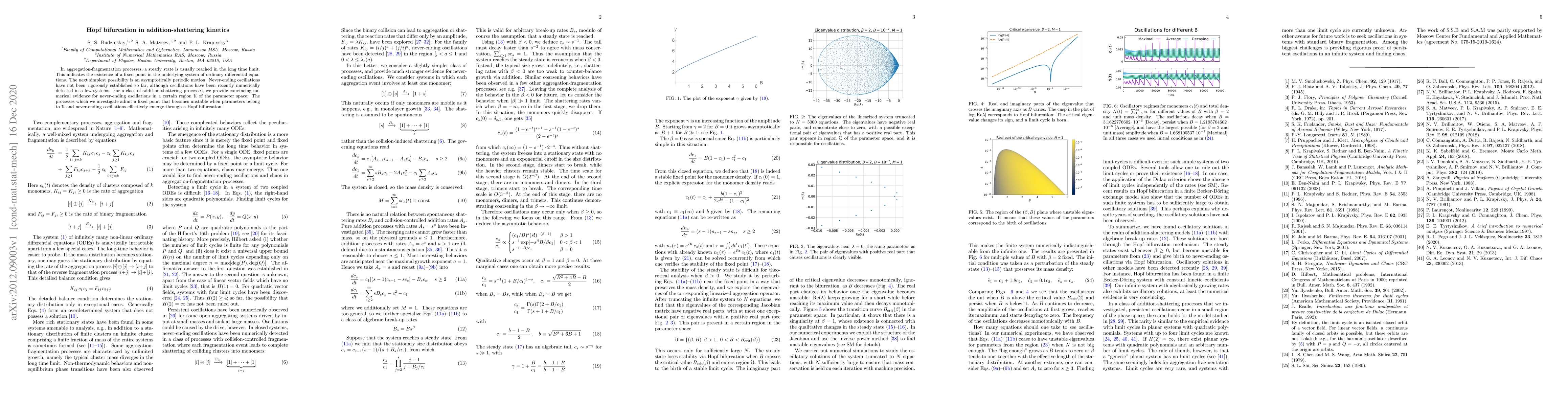 This paper presents numerical evidence for the emergence of never-ending oscillations in addition-shattering kinetics through a Hopf bifurcation, challenging the usual steady state behavior in aggregation-fragmentation processes. The study identifies a specific parameter region where these oscillations arise, demonstrating a transition from a stable fixed point to periodic motion.