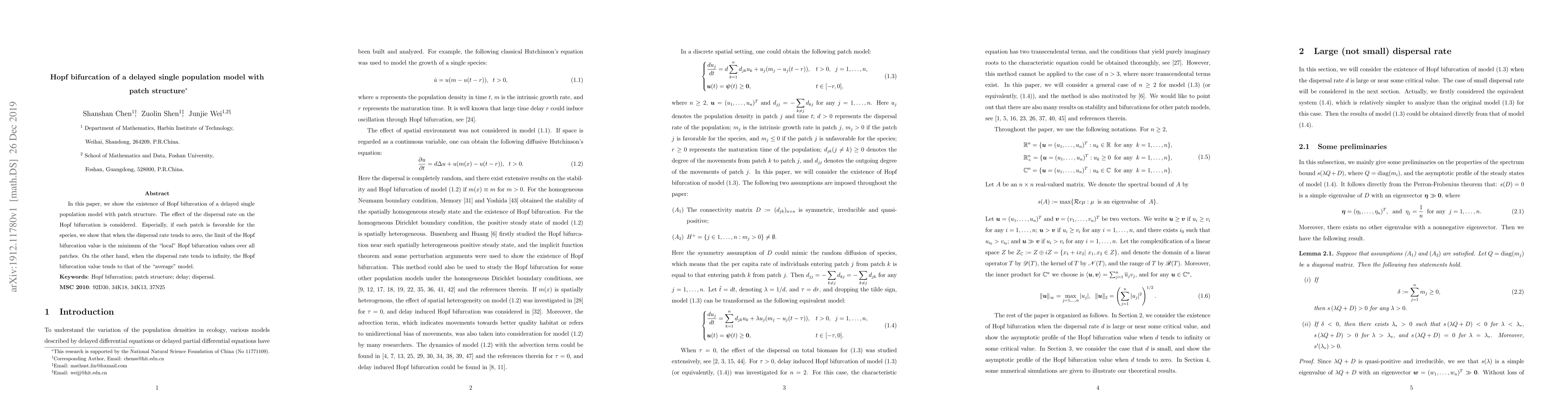 This paper investigates Hopf bifurcation in a delayed single population model with a patch structure, demonstrating how the dispersal rate influences this bifurcation. It finds that the Hopf bifurcation value converges to the minimum local value when dispersal is minimal and to the average model value when dispersal is maximal.