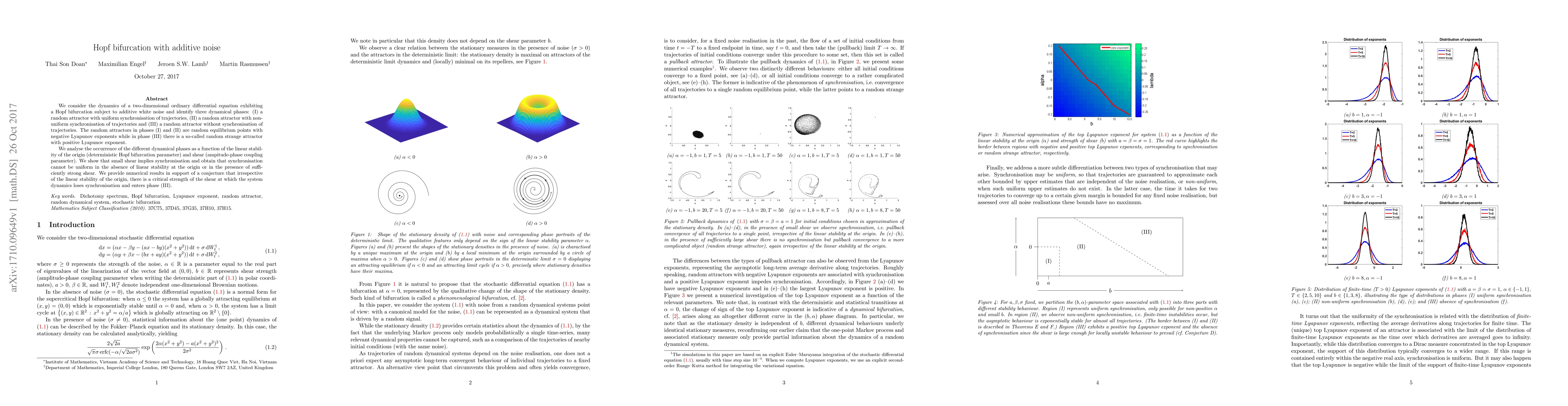 This paper investigates the dynamics of a two-dimensional system undergoing Hopf bifurcation with additive noise, identifying three phases: random attractors with varying synchronisation levels. It demonstrates that small shear leads to synchronisation, while strong shear disrupts it, revealing a critical shear strength for loss of synchronisation.