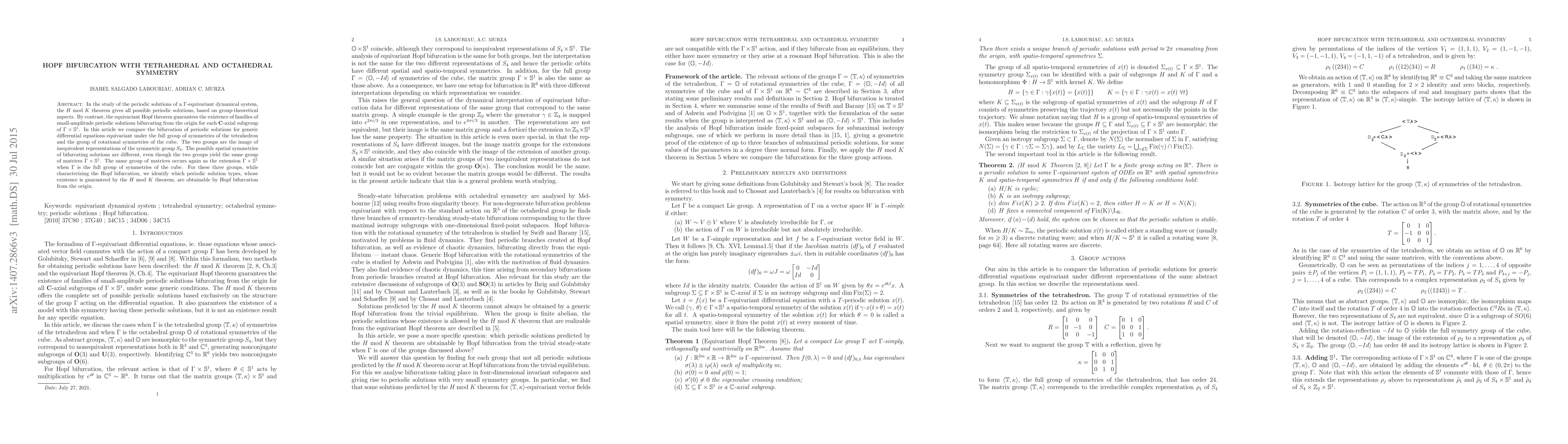 In the study of the periodic solutions of a $\Gamma$-equivariant dynamical system, the $H~\mathrm{mod}~K$ theorem gives all possible periodic solutions, based on group-theoretical aspects. By contrast, the equivariant Hopf theorem guarantees the existence of families of small-amplitude periodic solutions bifurcating from the origin for each $\mathbf{C}$-axial subgroup of $\Gamma\times\mathbb{S}^1$. In this article we compare the bifurcation of periodic solutions for generic differential equations equivariant under the full group of symmetries of the tetrahedron and the group of rotational symmetries of the cube. The two groups are the image of inequivalent representations of the symmetric group $S_4$. The possible spatial symmetries of bifurcating solutions are different, even though the two groups yield the same group of matrices $\Gamma\times\mathbb{S}^1$. The same group of matrices occurs again as the extension $\Gamma\times\mathbb{S}^1$ when $\Gamma$ is the full group of symmetries of the cube. For these three groups, while characterizing the Hopf bifurcation, we identify which periodic solution types, whose existence is guaranteed by the $H~\mathrm{mod}~K$ theorem, are obtainable by Hopf bifurcation from the origin.