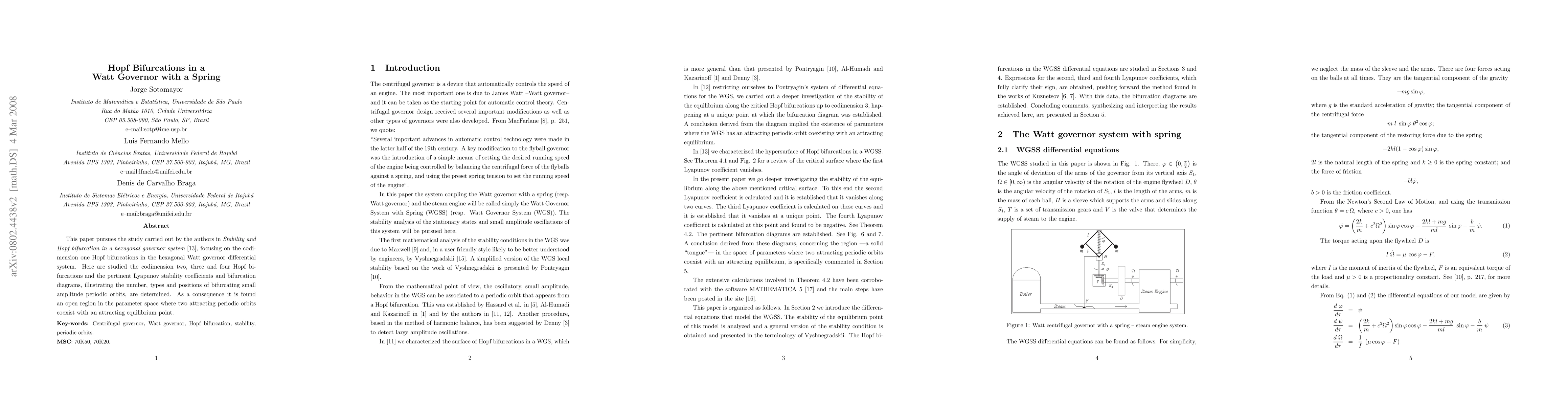 This paper investigates codimension two, three, and four Hopf bifurcations in a hexagonal Watt governor system, determining Lyapunov stability coefficients and bifurcation diagrams that reveal the coexistence of two attracting periodic orbits with an attracting equilibrium point in a specific parameter region.