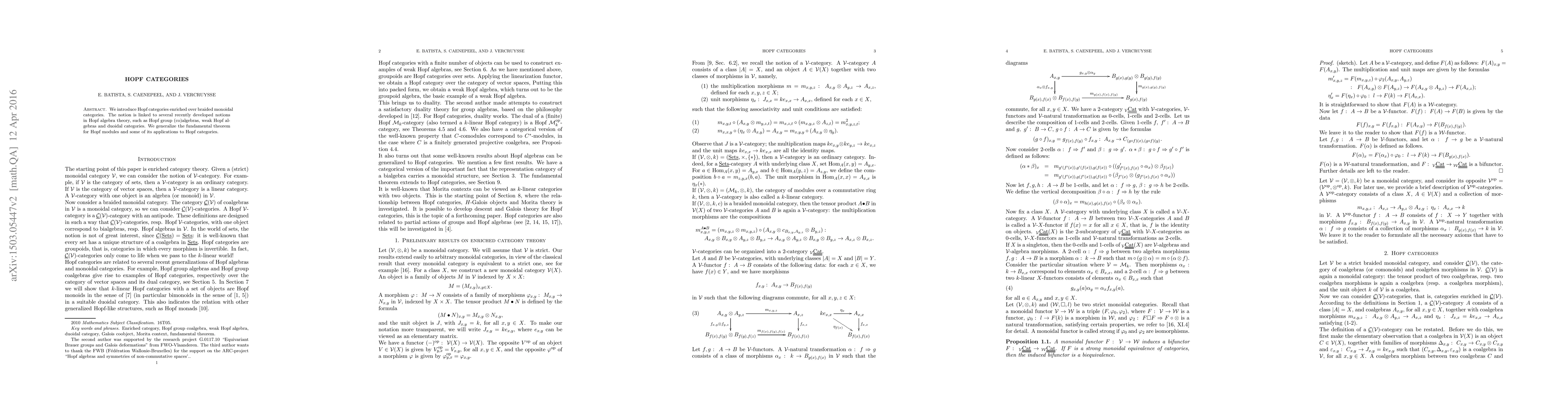 Summary: This paper introduces Hopf categories enriched within braided monoidal categories, linking them to recent developments in Hopf algebra theory, and generalizes the fundamental theorem for Hopf modules and its applications.