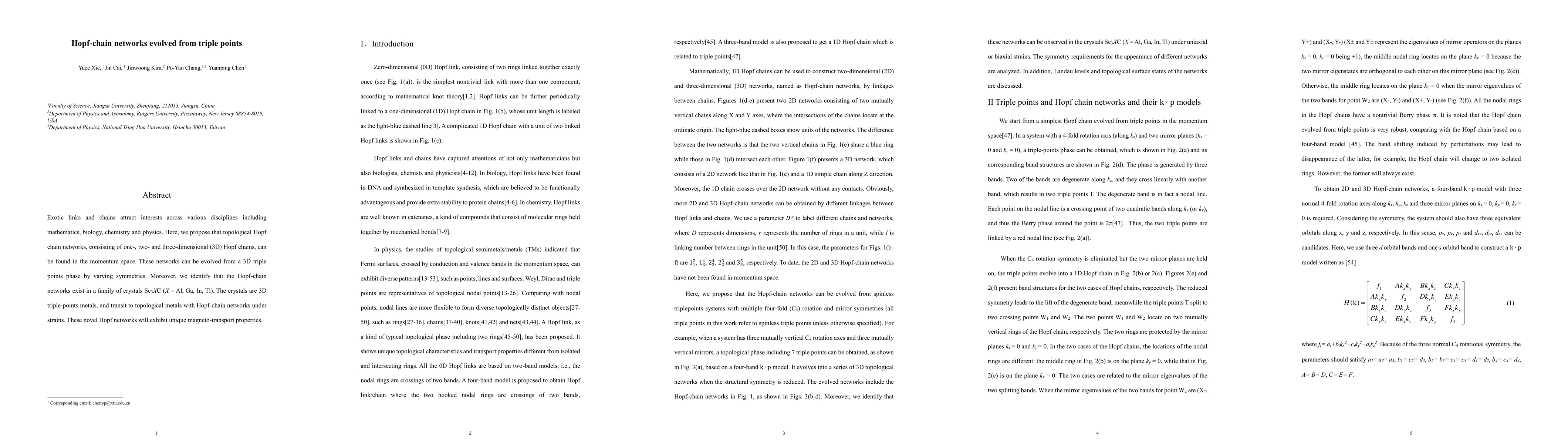 Exotic links and chains attract interests across various disciplines including mathematics, biology, chemistry and physics. Here, we propose that topological Hopf-chain networks, consisting of one-, two- and three-dimensional (3D) Hopf chains, can be found in the momentum space. These networks can be evolved from a 3D triple-points phase by varying symmetries of a four-band model. Moreover, we identify that the Hopf-chain networks exist in a family of crystals Sc3XC (X = Al, Ga, In, Tl). The crystals are 3D triple-points metals, and transit to topological metals with Hopf-chain networks under strains. These novel Hopf networks exhibit unique Landau levels and magneto-transport properties.