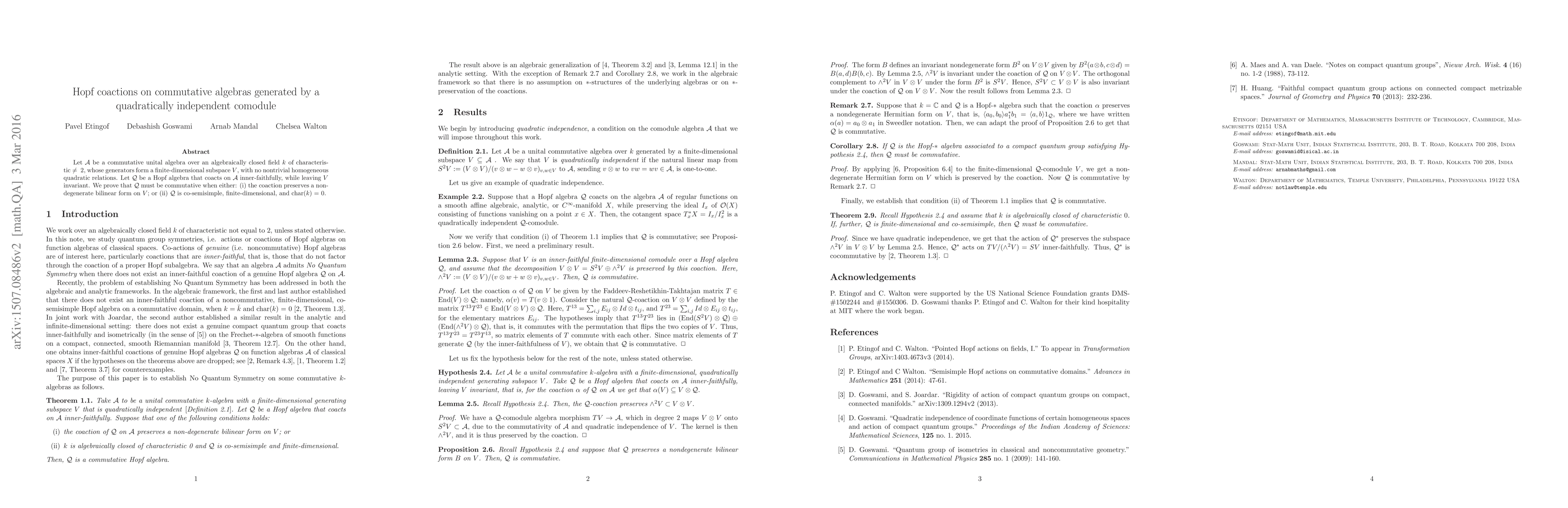 Let A be a commutative unital algebra over an algebraically closed field k of characteristic not equal to 2, whose generators form a finite-dimensional subspace V, with no nontrivial homogeneous quadratic relations. Let Q be a Hopf algebra that coacts on A inner-faithfully, while leaving V invariant. We prove that Q must be commutative when either: (i) the coaction preserves a non-degenerate bilinear form on V; or (ii) Q is co-semisimple, finite-dimensional, and char(k)=0.