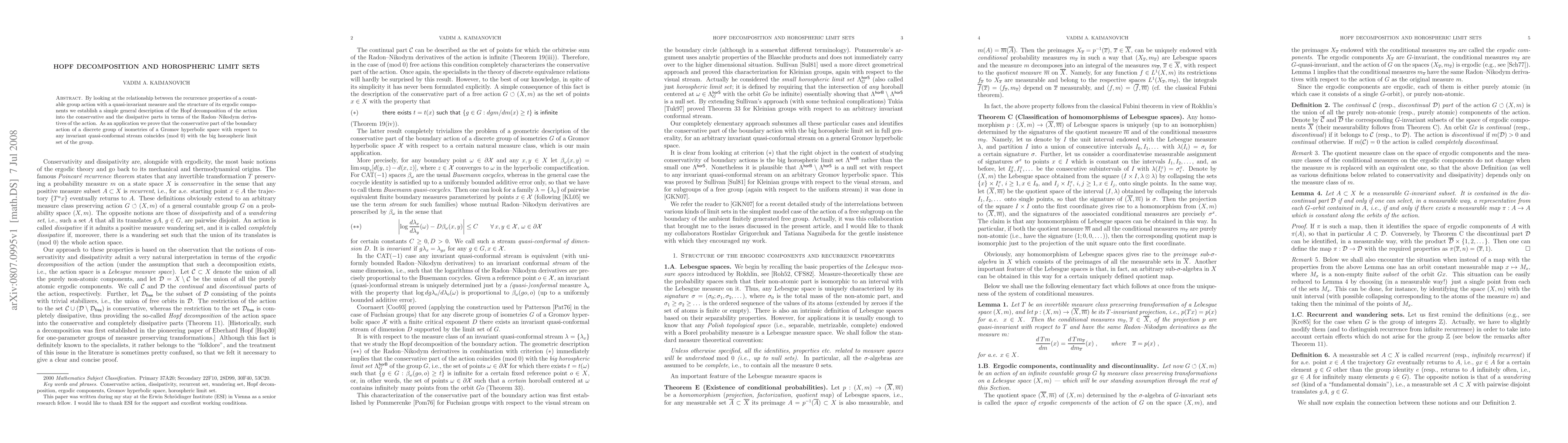 By looking at the relationship between the recurrence properties of a countable group action with a quasi-invariant measure and the structure of its ergodic components we establish a simple general description of the Hopf decomposition of the action into the conservative and the dissipative parts in terms of the Radon--Nikodym derivatives of the action. As an application we prove that the conservative part of the boundary action of a discrete group of isometries of a Gromov hyperbolic space with respect to any invariant quasi-conformal stream coincides (mod 0) with the big horospheric limit set of the group.