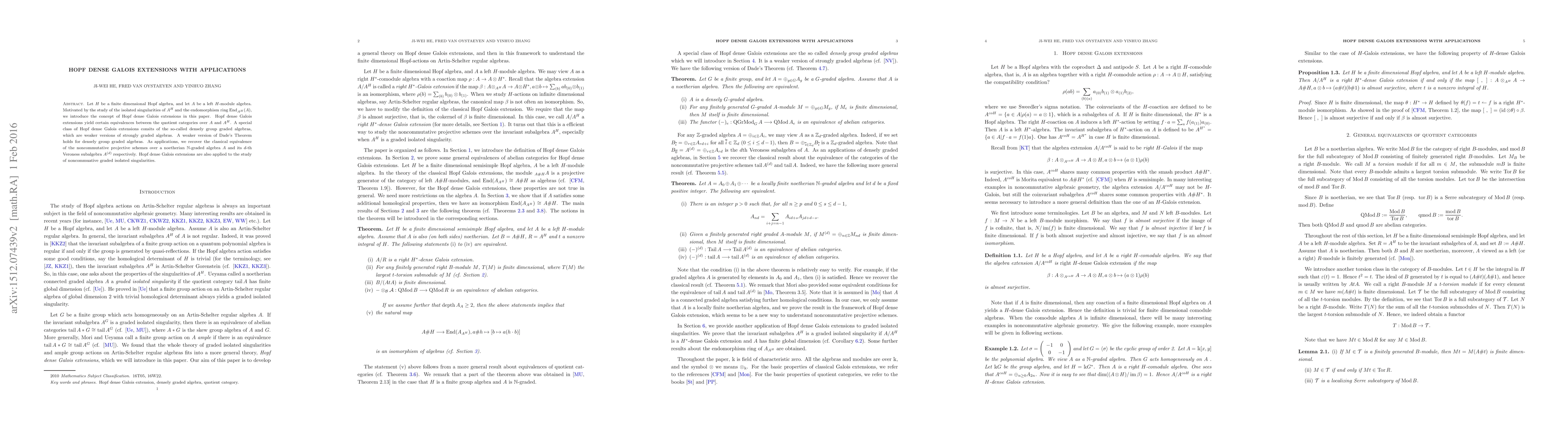 Let $H$ be a finite dimensional Hopf algebra, and let $A$ be a left $H$-module algebra. Motivated by the study of the isolated singularities of $A^H$ and the endomorphism ring $\mathrm{End}_{A^H}(A)$, we introduce the concept of Hopf dense Galois extensions in this paper. Hopf dense Galois extensions yield certain equivalences between the quotient categories over $A$ and $A^H$. A special class of Hopf dense Galois extensions consits of the so-called densely group graded algebras, which are weaker versions of strongly graded algebras. A weaker version of Dade's Theorem holds for densely group graded algebras. As applications, we recover the classical equivalence of the noncommutative projective schemes over a noetherian $\mathbb{N}$-graded algebra $A$ and its $d$-th Veroness subalgebra $A^{(d)}$ respectively. Hopf dense Galois extensions are also applied to the study of noncommuative graded isolated singularities.