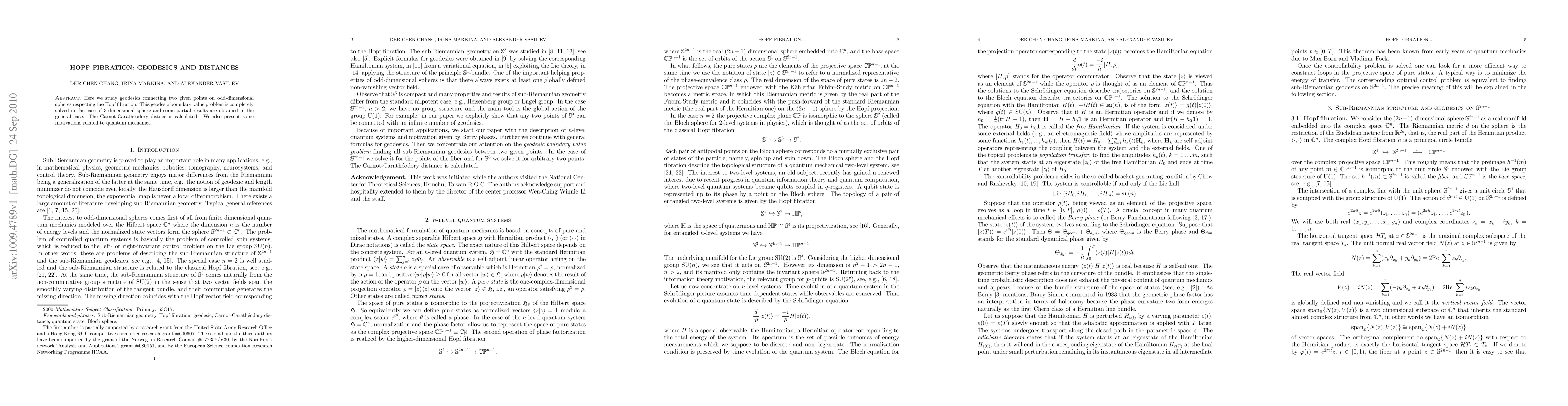 Here we study geodesics connecting two given points on odd-dimensional spheres respecting the Hopf fibration. This geodesic boundary value problem is completely solved in the case of 3-dimensional sphere and some partial results are obtained in the general case. The Carnot-Carath\'eodory distance is calculated. We also present some motivations related to quantum mechanics.