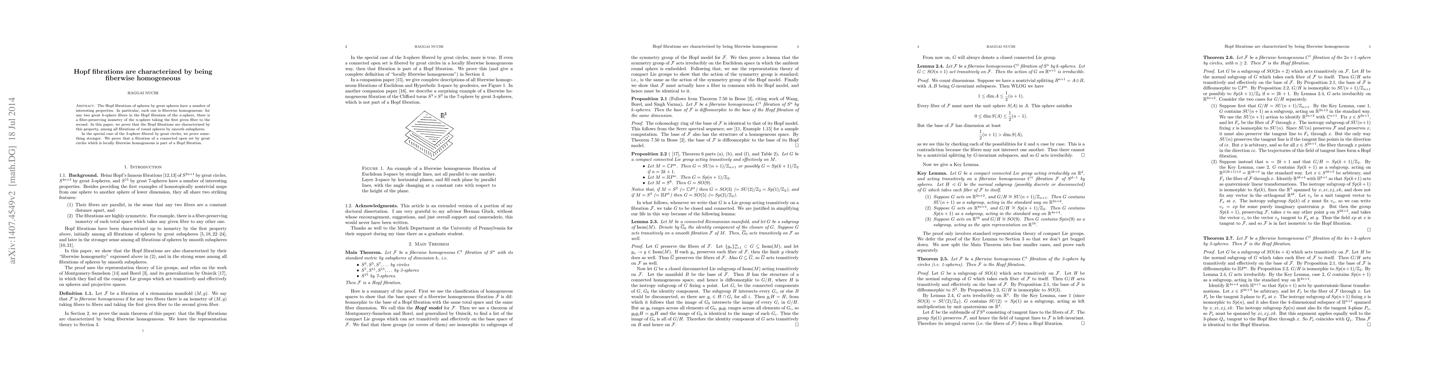 This paper characterizes Hopf fibrations by their fiberwise homogeneity, demonstrating that they are distinguished among all fibrations of spheres by smooth subspheres due to the presence of a fiber-preserving isometry. Additionally, it proves that any locally fiberwise homogeneous fibration of a connected open set by great circles is part of a Hopf fibration.