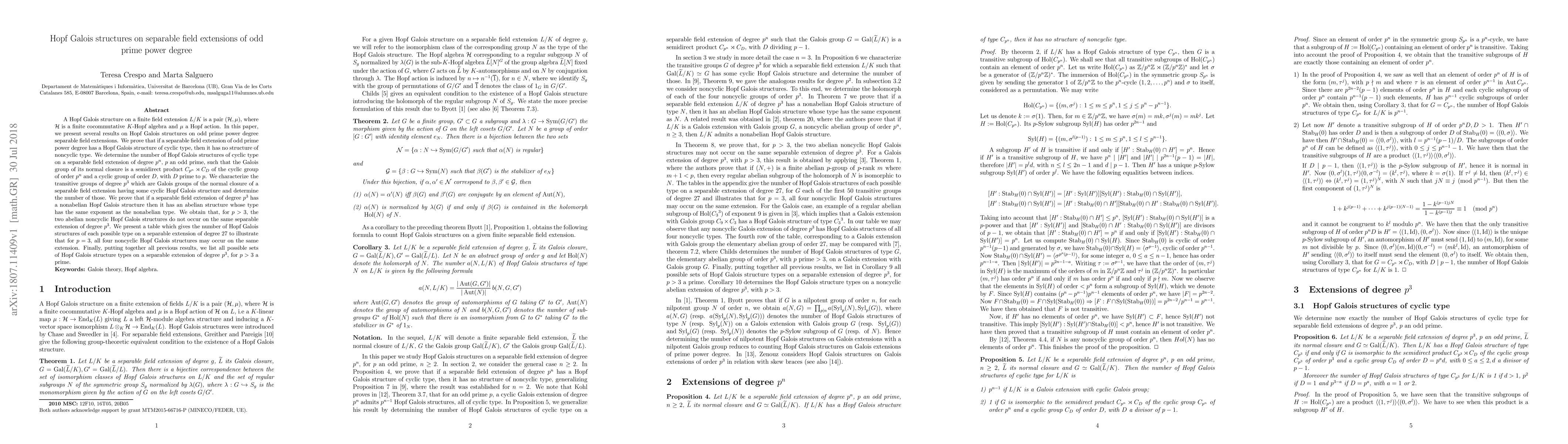 This paper investigates Hopf Galois structures on separable field extensions of odd prime power degree, proving that cyclic and noncyclic structures cannot coexist and determining the number of cyclic structures for specific group types. It also characterizes and counts Galois groups of normal closures with certain properties and explores the coexistence of abelian and nonabelian Hopf Galois structures.