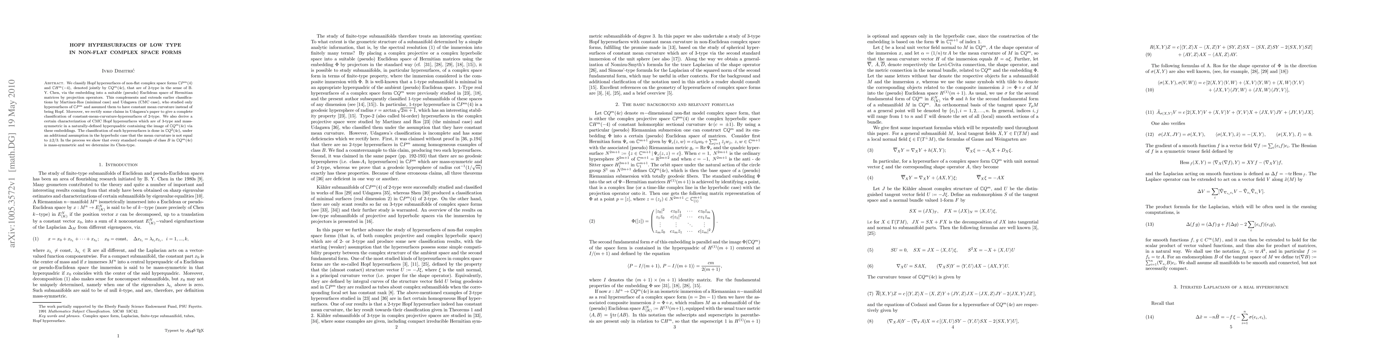 We classify Hopf hypersurfaces of non-flat complex space forms CP^m(4) and CH^m(-4), denoted jointly by CQ^m(4c), that are of 2-type in the sense of B. Y. Chen, via the embedding into a suitable (pseudo) Euclidean space of Hermitian matrices by projection operators. This complements and extends earlier classifications by Martinez-Ros (minimal case) and Udagawa (CMC case), who studied only hypersurfaces of CP^m and assumed them to have constant mean curvature instead of being Hopf. Moreover, we rectify some claims in Udagawa's paper to give a complete classification of constant-mean-curvature-hypersurfaces of 2-type. We also derive a certain characterization of CMC Hopf hypersurfaces which are of 3-type and mass-symmetric in a naturally defined hyperquadric containing the image of CQ^m(4c) via these embeddings. The classification of such hypersurfaces is done in CQ^2(4c), under an additional assumption in the hyperbolic case that the mean curvature is not equal to 2/3. In the process we show that every standard example of class B in CQ^m(4c) is mass-symmetric and we determine its Chen-type.