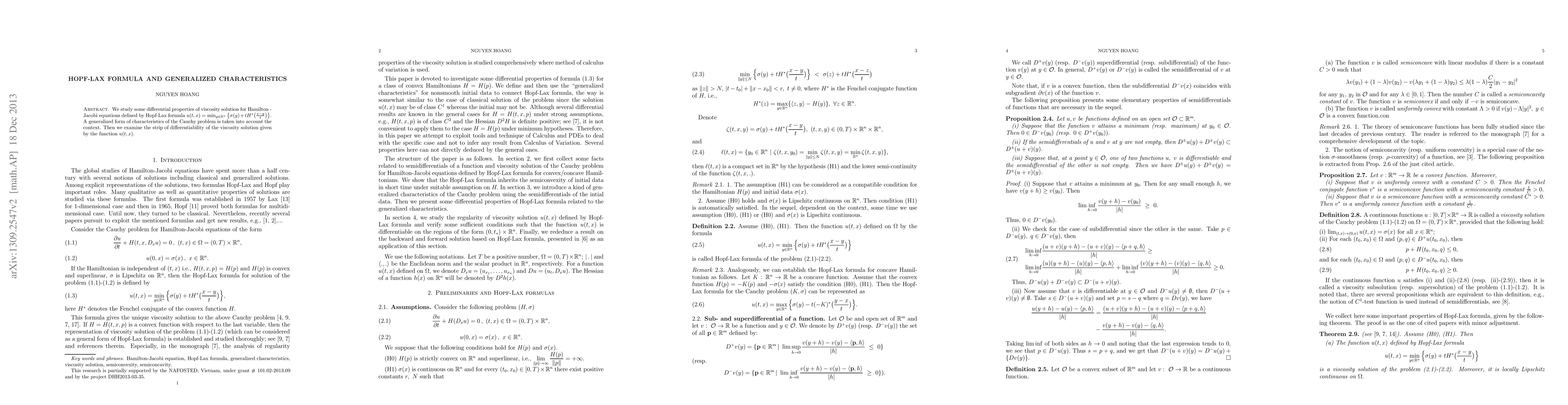 This paper studies the Hopf-Lax formula for Hamilton-Jacobi equations and its relation to generalized characteristics of Cauchy problems, focusing on the strip of differentiability of viscosity solutions.