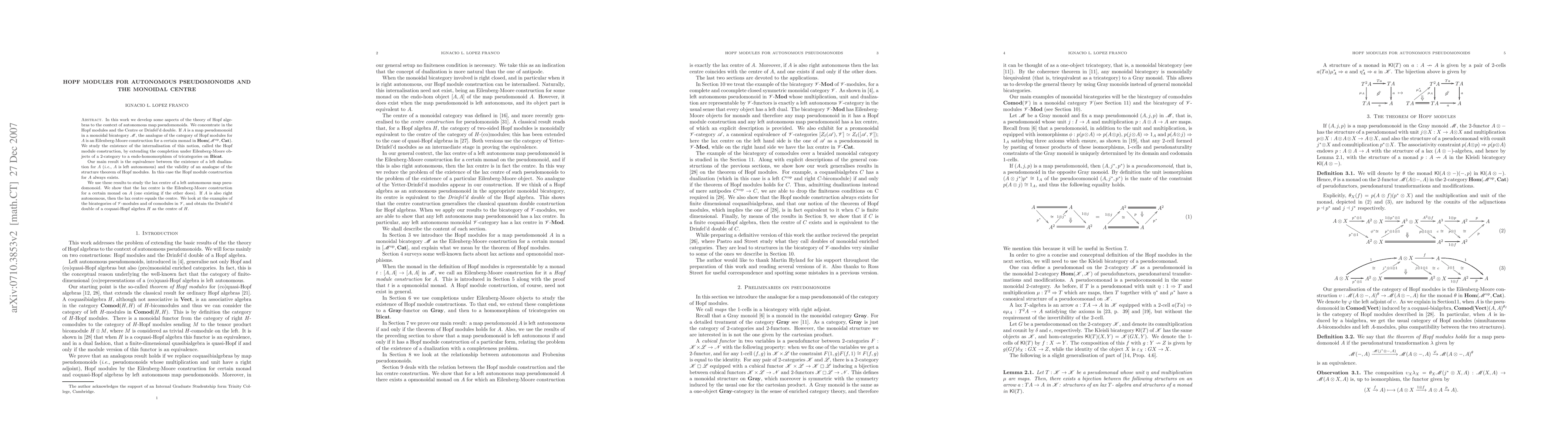 In this work we develop some aspects of the theory of Hopf algebras to the context of autonomous map pseudomonoids. We concentrate in the Hopf modules and the Centre or Drinfel'd double. If $A$ is a map pseudomonoid in a monoidal bicategory \M, the analogue of the category of Hopf modules for $A$ is an Eilenberg-Moore construction for a certain monad in $\mathbf{Hom}(\M^{\mathrm{op}},\mathbf{Cat})$. We study the existence of the internalisation of this notion, called the Hopf module construction, by extending the completion under Eilenberg-Moore objects of a 2-category to a endo-homomorphism of tricategories on $\mathbf{Bicat}$. Our main result is the equivalence between the existence of a left dualization for $A$ ({\em i.e.}, $A$ is left autonomous) and the validity of an analogue of the structure theorem of Hopf modules. In this case the Hopf module construction for $A$ always exists. We use these results to study the lax centre of a left autonomous map pseudomonoid. We show that the lax centre is the Eilenberg-Moore construction for a certain monad on $A$ (one existing if the other does). If $A$ is also right autonomous, then the lax centre equals the centre. We look at the examples of the bicategories of \V-modules and of comodules in \V, and obtain the Drinfel'd double of a coquasi-Hopf algebra $H$ as the centre of $H$.