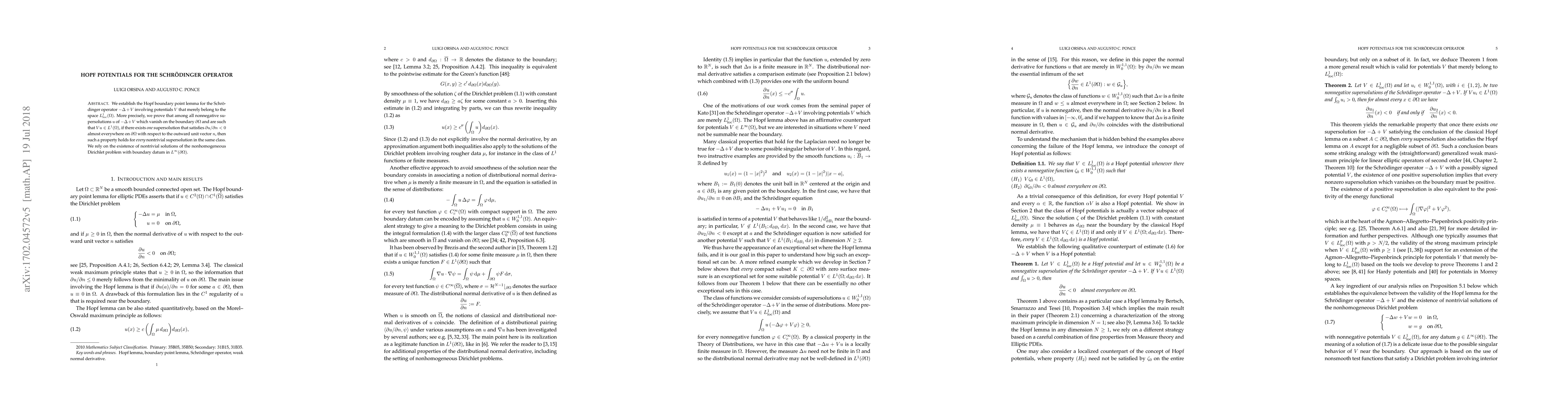 We establish the Hopf boundary point lemma for the Schr\"odinger operator $-\Delta + V$ involving potentials $V$ that merely belong to the space $L^{1}_{loc}(\Omega)$. More precisely, we prove that among all supersolutions $u$ of $-\Delta + V$ which vanish on the boundary $\partial\Omega$ and are such that $V u \in L^{1}(\Omega)$, if there exists one supersolution which satisfies $\partial u/\partial n < 0$ almost everywhere on $\partial\Omega$ with respect to the outward unit vector $n$, then such a property holds for every nontrivial supersolution in the same class. We rely on the existence of nontrivial solutions of the nonhomogeneous Dirichlet problem with boundary datum in $L^{\infty}(\partial\Omega)$.