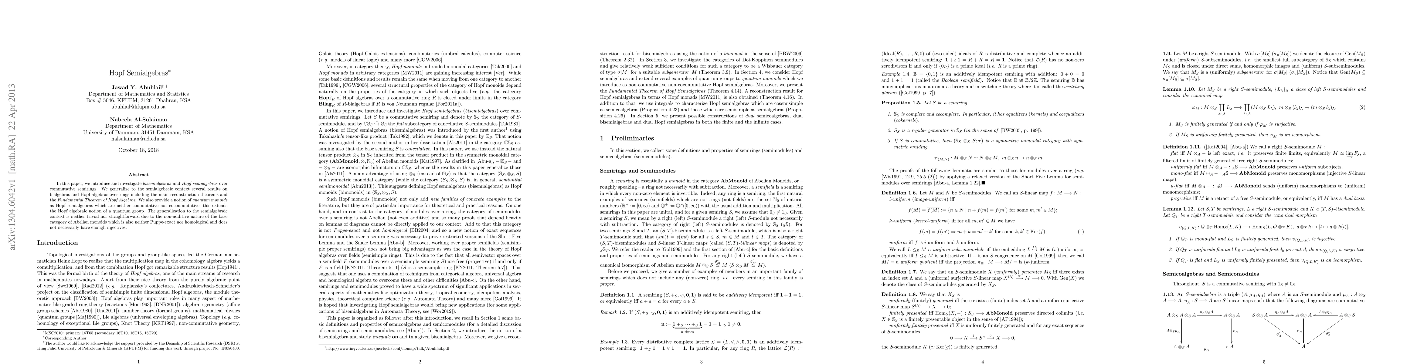 In this paper, we introduce and investigate \emph{bisemialgebras}and\emph{\ Hopf semialgebras} over commutative semirings. We generalize to the semialgebraic context several results on bialgebras and Hopf algebras over rings including the main reconstruction theorems and the \emph{Fundamental Theorem of Hopf Algebras}. We also provide a notion of \emph{quantum monoids} as Hopf semialgebras which are neither commutative nor cocommutative; this extends the Hopf algebraic notion of a quantum group. The generalization to the semialgebraic context is neither trivial nor straightforward due to the non-additive nature of the base category of Abelian monoids which is also neither Puppe-exact nor homological and does not necessarily have enough injectives.