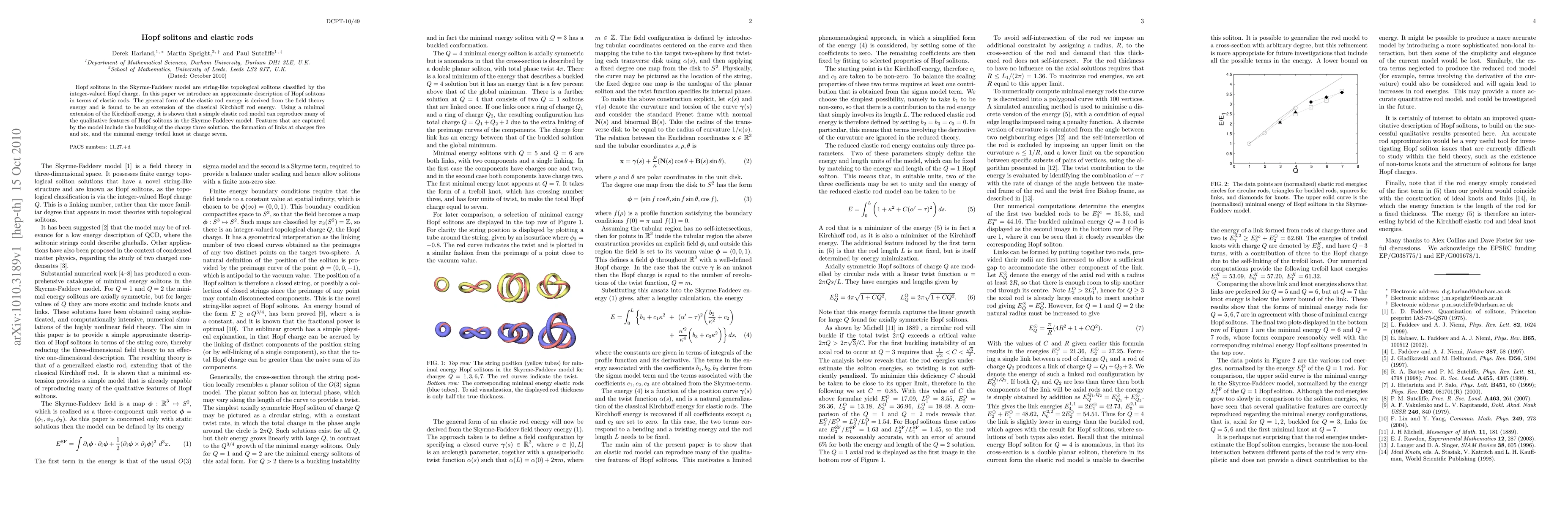 This paper explores the connection between Hopf solitons in the Skyrme-Faddeev model and elastic rods, deriving an approximate elastic rod energy from field theory. It demonstrates that a minimal extension of the Kirchhoff rod energy can reproduce key qualitative features of Hopf solitons, including specific knot formations and buckling behaviors.