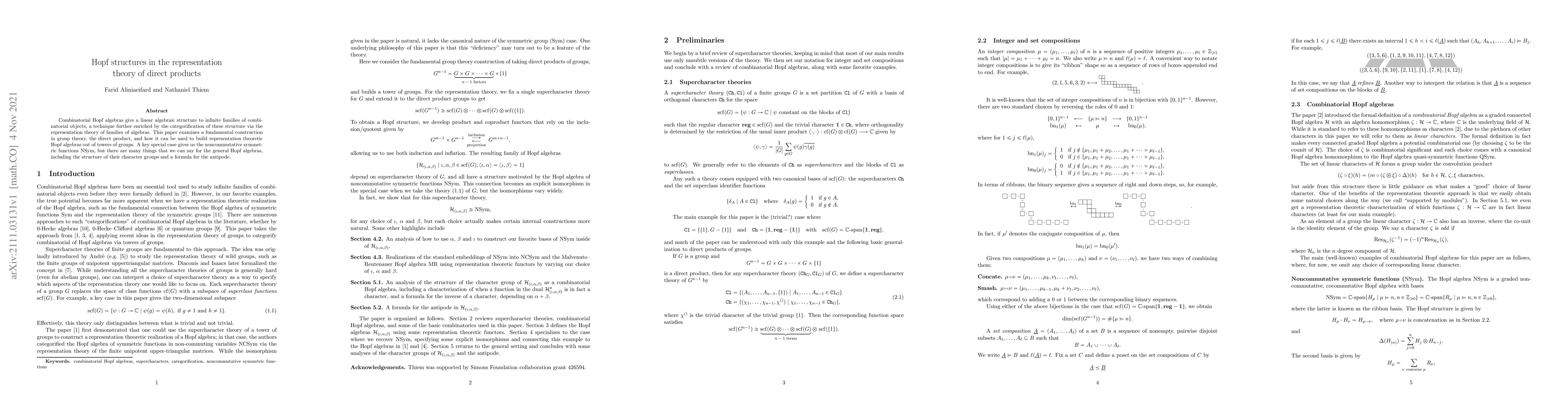 Combinatorial Hopf algebras give a linear algebraic structure to infinite families of combinatorial objects, a technique further enriched by the categorification of these structure via the representation theory of families of algebras. This paper examines a fundamental construction in group theory, the direct product, and how it can be used to build representation theoretic Hopf algebras out of towers of groups. A key special case gives us the noncommutative symmetric functions NSym, but there are many things that we can say for the general Hopf algebras, including the structure of their character groups and a formula for the antipode.