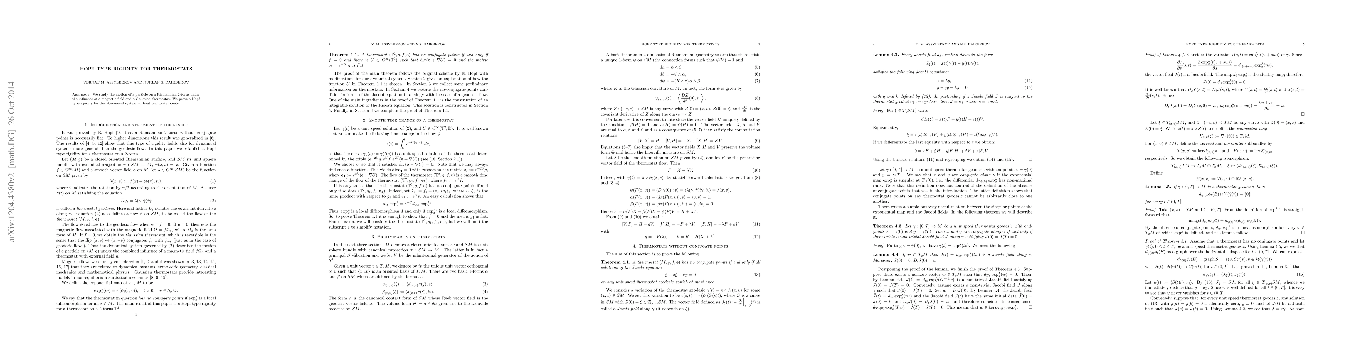 We show a Hopf type rigidity for thermostats without conjugate points on a 2-torus