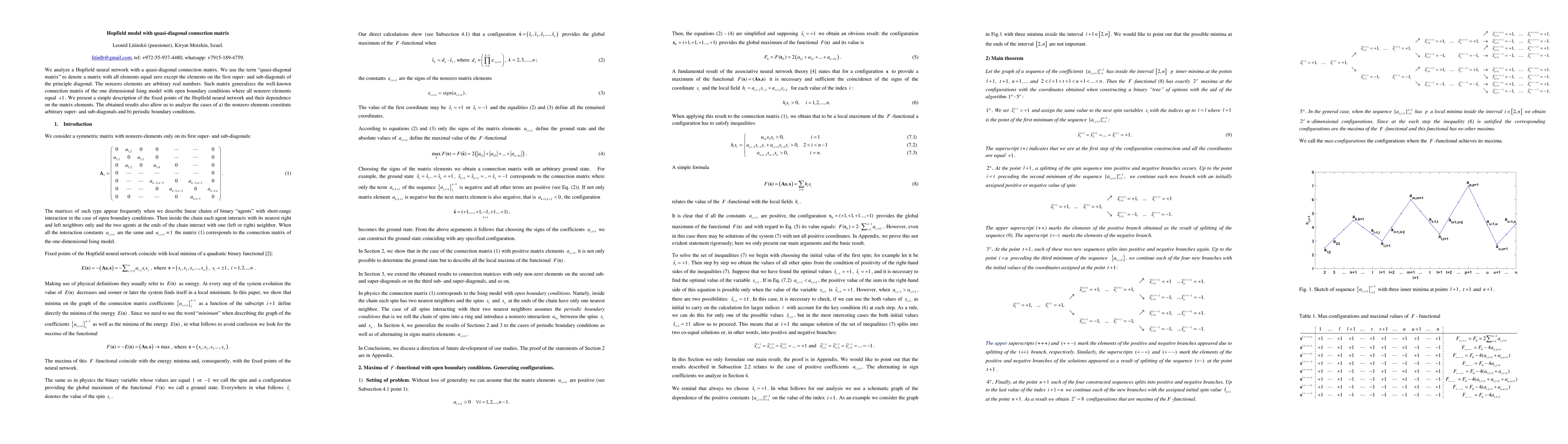 The paper presents a detailed analysis of Hopfield neural networks with quasi-diagonal connection matrices, introducing a recursive algorithm to determine optimal spin configurations and establishing relationships between max-configurations under different boundary conditions.