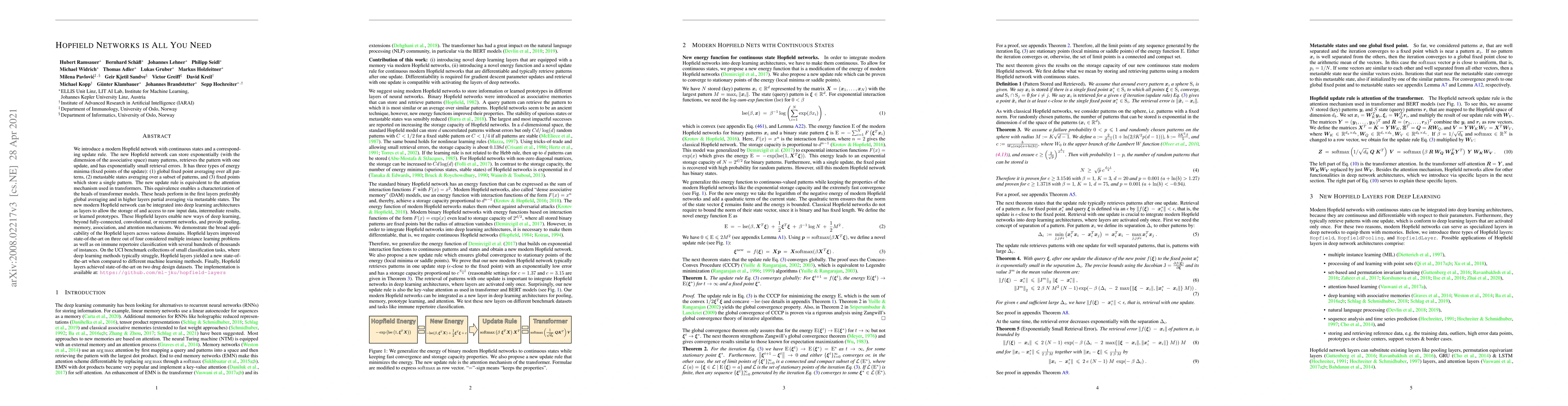 We introduce a modern Hopfield network with continuous states and a corresponding update rule. The new Hopfield network can store exponentially (with the dimension of the associative space) many patterns, retrieves the pattern with one update, and has exponentially small retrieval errors. It has three types of energy minima (fixed points of the update): (1) global fixed point averaging over all patterns, (2) metastable states averaging over a subset of patterns, and (3) fixed points which store a single pattern. The new update rule is equivalent to the attention mechanism used in transformers. This equivalence enables a characterization of the heads of transformer models. These heads perform in the first layers preferably global averaging and in higher layers partial averaging via metastable states. The new modern Hopfield network can be integrated into deep learning architectures as layers to allow the storage of and access to raw input data, intermediate results, or learned prototypes. These Hopfield layers enable new ways of deep learning, beyond fully-connected, convolutional, or recurrent networks, and provide pooling, memory, association, and attention mechanisms. We demonstrate the broad applicability of the Hopfield layers across various domains. Hopfield layers improved state-of-the-art on three out of four considered multiple instance learning problems as well as on immune repertoire classification with several hundreds of thousands of instances. On the UCI benchmark collections of small classification tasks, where deep learning methods typically struggle, Hopfield layers yielded a new state-of-the-art when compared to different machine learning methods. Finally, Hopfield layers achieved state-of-the-art on two drug design datasets. The implementation is available at: https://github.com/ml-jku/hopfield-layers