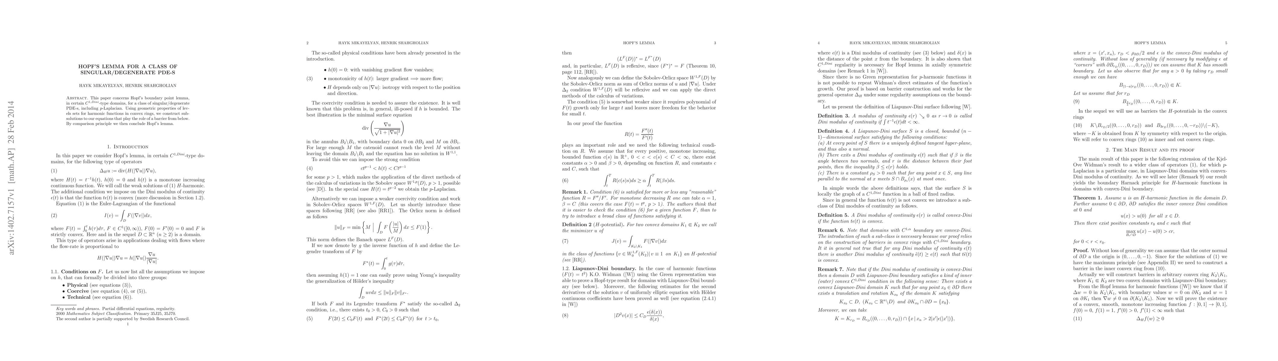 This research establishes Hopf's boundary point lemma for a specific class of singular/degenerate PDEs, incorporating the p-Laplacian, in $C^{1,Dini}$-type domains. It employs geometric properties of level sets for harmonic functions in convex rings to construct sub-solutions acting as barriers, ultimately confirming Hopf's lemma via a comparison principle.