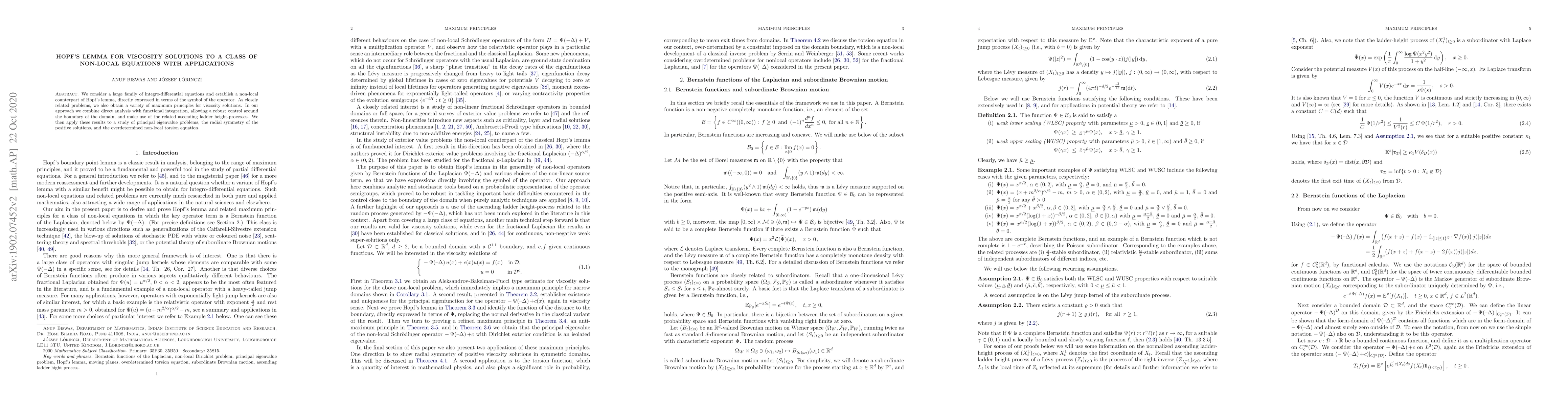This paper establishes a non-local version of Hopf's lemma for viscosity solutions of a broad class of integro-differential equations, employing functional integration and boundary control techniques. The results are applied to principal eigenvalue problems, symmetry properties of positive solutions, and the overdetermined non-local torsion equation.