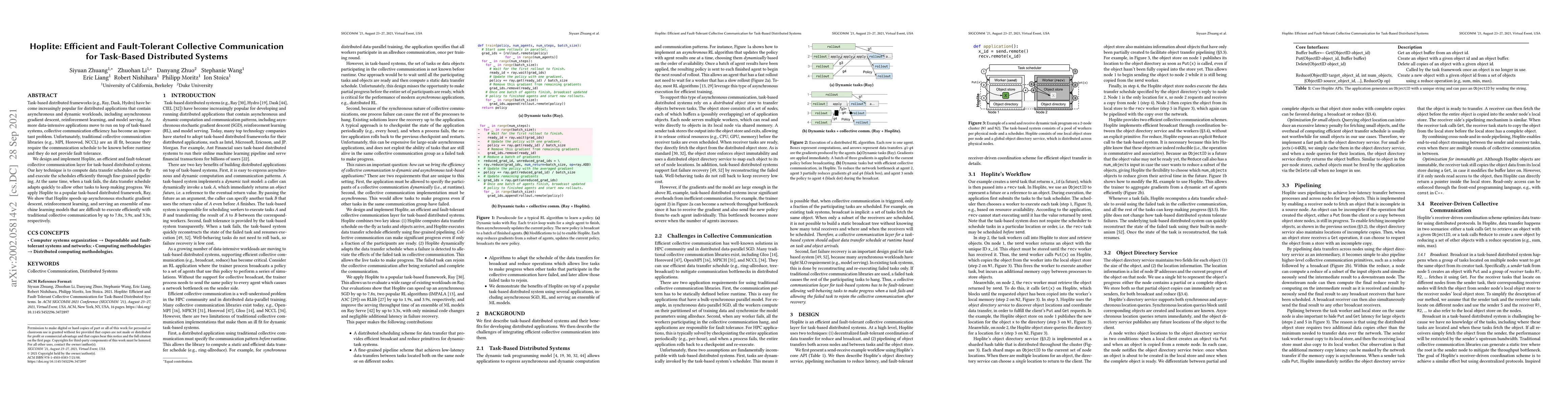 Hoplite is a new collective communication layer designed for task-based distributed systems, enabling efficient on-the-fly scheduling and fault tolerance. It significantly improves the performance of applications like gradient descent and reinforcement learning, achieving up to 7.8x speedup over traditional methods.