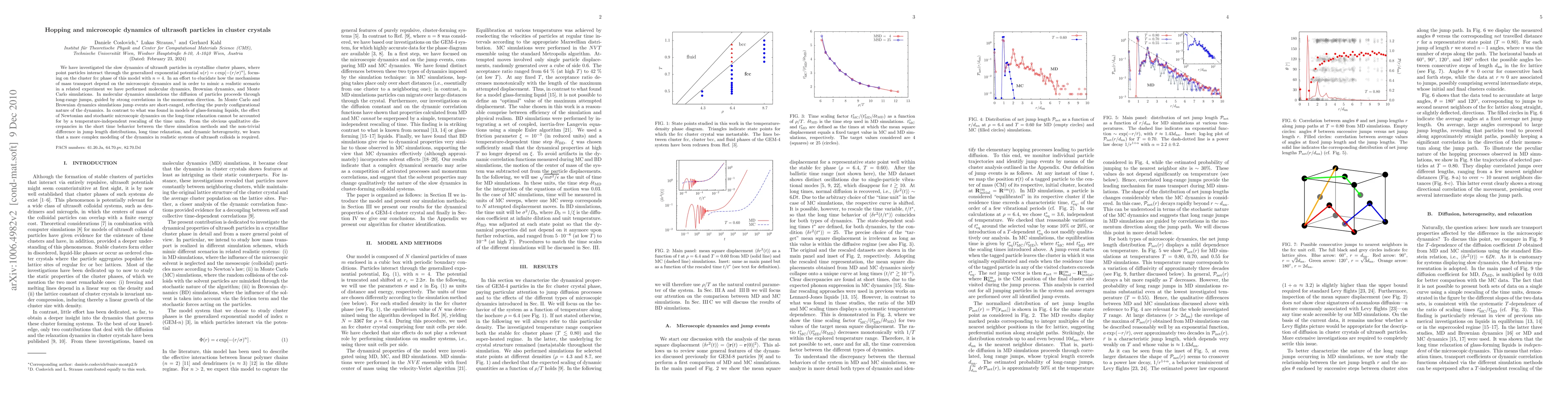 This paper investigates the slow dynamics of ultrasoft particles in crystalline cluster phases using molecular, Brownian, and Monte Carlo simulations. It finds that long-range jumps dominate in molecular dynamics, while short-range jumps prevail in Monte Carlo and Brownian dynamics, highlighting the need for more complex models to accurately describe ultrasoft colloidal systems.