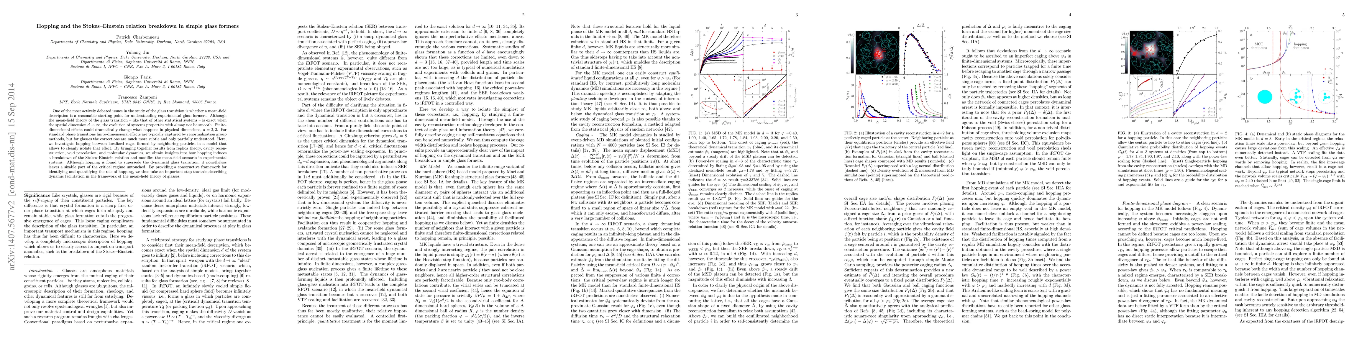 This paper explores the impact of particle hopping between localized cages on the dynamics of simple glass formers, revealing a breakdown of the Stokes-Einstein relation and challenging mean-field descriptions. It combines replica theory, cavity reconstruction, and molecular dynamics to show that while hopping alters the dynamics, it does not fully replace the traditional dynamical glass transition.