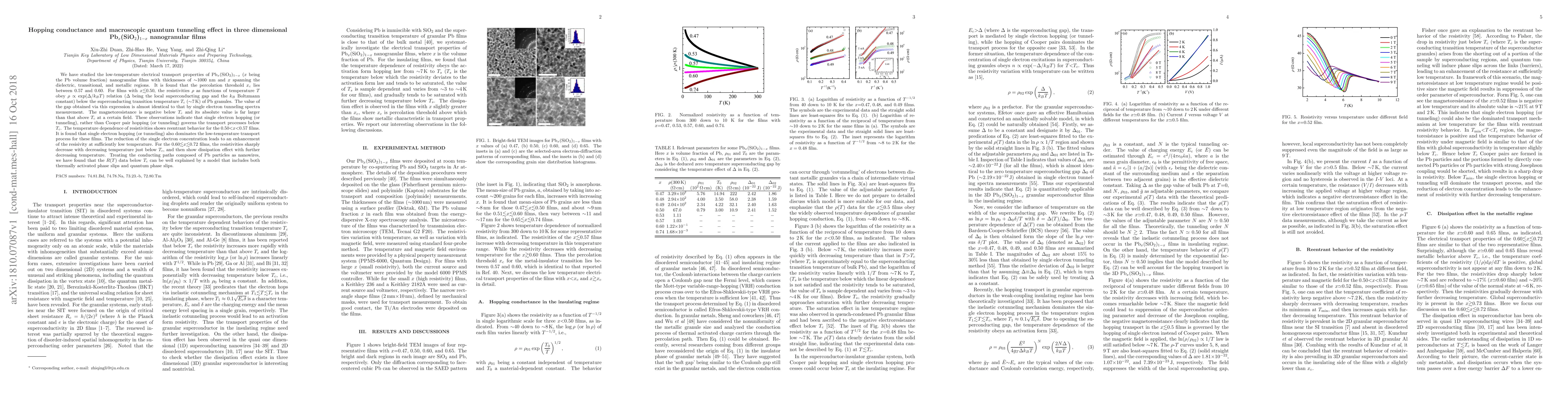 We have studied the low-temperature electrical transport properties of Pb$_x$(SiO$_2$)$_{1-x}$ ($x$ being the Pb volume fraction) nanogranular films with thicknesses of $\sim$1000 nm and $x$ spanning the dielectric, transitional, and metallic regions. It is found that the percolation threshold $x_c$ lies between 0.57 and 0.60. For films with $x$$\lesssim$0.50, the resistivities $\rho$ as functions of temperature $T$ obey $\rho\propto\exp(\Delta/k_BT)$ relation ($\Delta$ being the local superconducting gap and the $k_B$ Boltzmann constant) below the superconducting transition temperature $T_c$ ($\sim$7 K) of Pb granules. The value of the gap obtained via this expression is almost identical to that by single electron tunneling spectra measurement. The magnetoresistance is negative below $T_c$ and its absolute value is far larger than that above $T_c$ at a certain field. These observations indicate that single electron hopping (or tunneling), rather than Cooper pair hopping (or tunneling) governs the transport processes below $T_c$. The temperature dependence of resistivities shows reentrant behavior for the 0.50$<$$x$$<$0.57 films. It is found that single electron hopping (or tunneling) also dominates the low-temperature transport process for these films. The reduction of the single electron concentration leads to an enhancement of the resisivity at sufficiently low temperature. For the 0.60$\lesssim$$x$$\lesssim$0.72 films, the resistivities sharply decrease with decreasing temperature just below $T_c$, and then show dissipation effect with further decreasing temperature. Treating the conducting paths composed of Pb particles as nanowires, we have found that the $R(T)$ data below $T_c$ can be well explained by a model that includes both thermally activated phase slips and quantum phase slips.