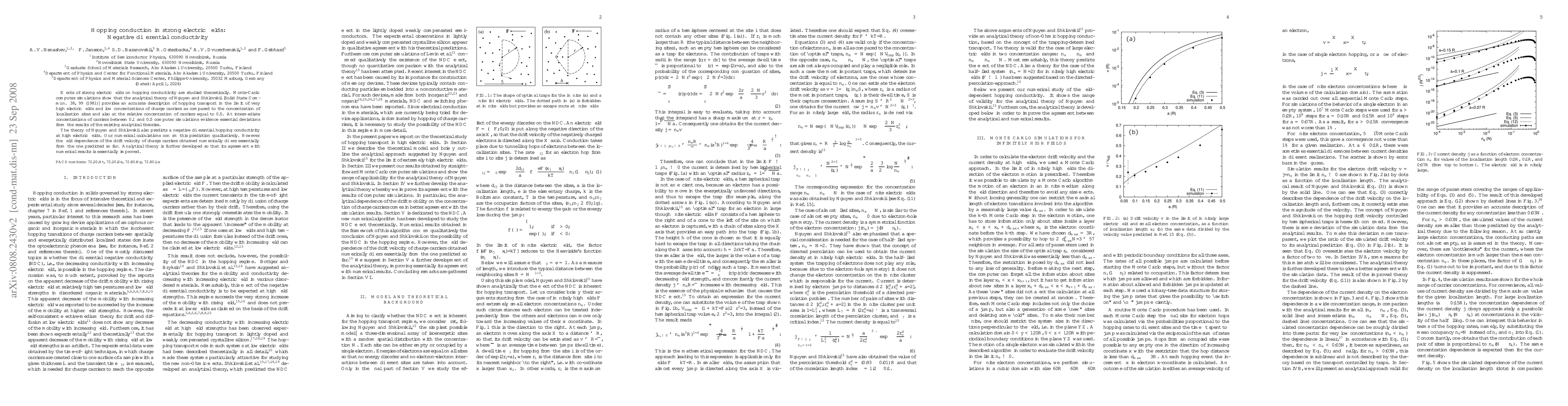 Effects of strong electric fields on hopping conductivity are studied theoretically. Monte-Carlo computer simulations show that the analytical theory of Nguyen and Shklovskii [Solid State Commun. 38, 99 (1981)] provides an accurate description of hopping transport in the limit of very high electric fields and low concentrations of charge carriers as compared to the concentration of localization sites and also at the relative concentration of carriers equal to 0.5. At intermediate concentrations of carriers between 0.1 and 0.5 computer simulations evidence essential deviations from the results of the existing analytical theories. The theory of Nguyen and Shklovskii also predicts a negative differential hopping conductivity at high electric fields. Our numerical calculations confirm this prediction qualitatively. However the field dependence of the drift velocity of charge carriers obtained numerically differs essentially from the one predicted so far. Analytical theory is further developed so that its agreement with numerical results is essentially improved.