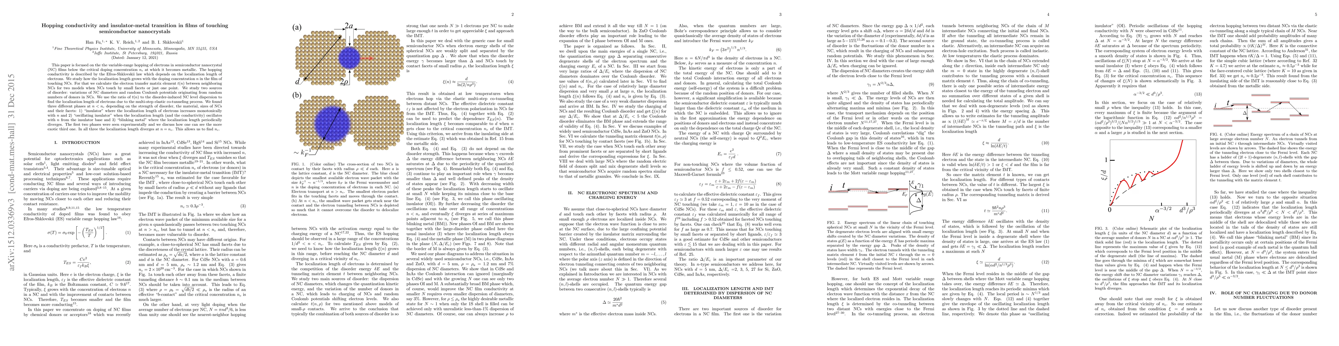 This paper investigates the variable-range hopping conductivity in films of touching semiconductor nanocrystals, identifying three distinct phases below the critical doping concentration for metal-insulator transition. The study reveals an "insulator," "oscillating insulator," and "blinking metal" phase, with the latter two phases characterized by varying localization length and conductivity, and the first two phases confirmed experimentally.