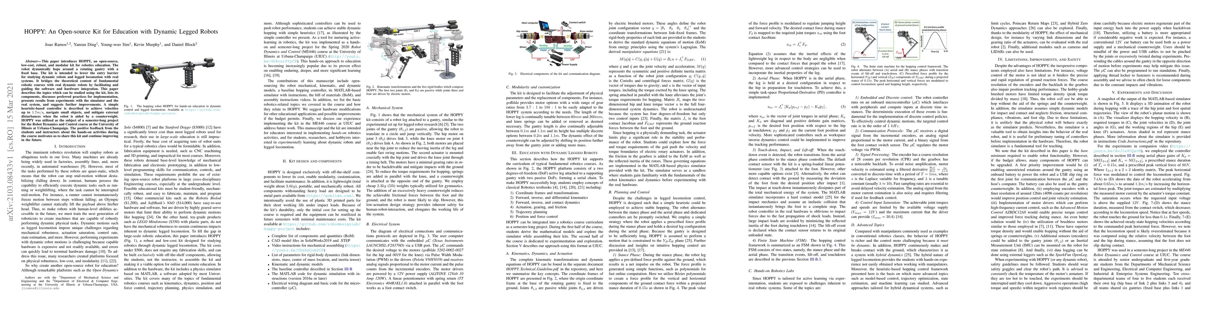 This open-source kit, HOPPY, facilitates robotics education with a low-cost, dynamic hopping robot that bridges theory with real systems. It enables students to study legged locomotion and control in a hands-on manner, achieving speeds of up to 1.7m/s and navigating obstacles.
