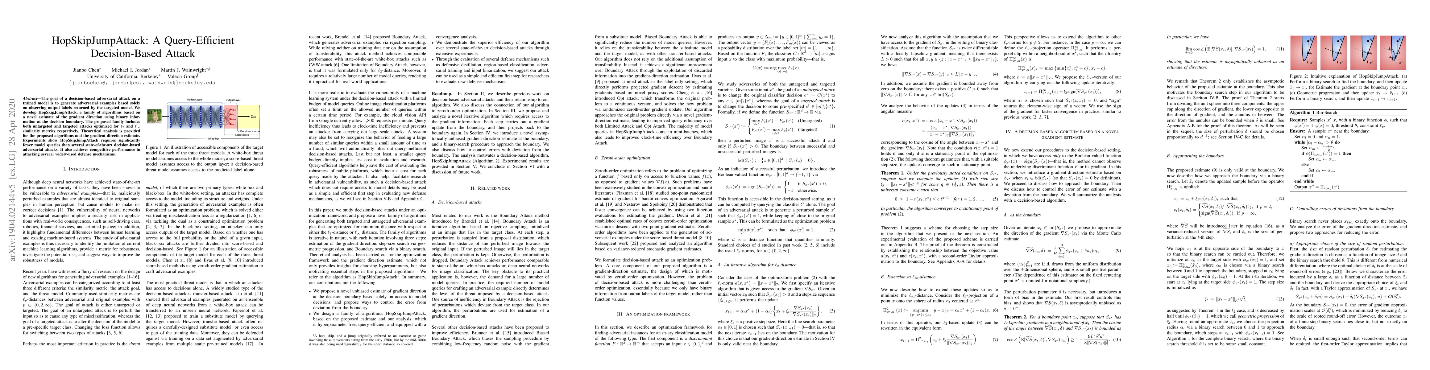 The goal of a decision-based adversarial attack on a trained model is to generate adversarial examples based solely on observing output labels returned by the targeted model. We develop HopSkipJumpAttack, a family of algorithms based on a novel estimate of the gradient direction using binary information at the decision boundary. The proposed family includes both untargeted and targeted attacks optimized for $\ell_2$ and $\ell_\infty$ similarity metrics respectively. Theoretical analysis is provided for the proposed algorithms and the gradient direction estimate. Experiments show HopSkipJumpAttack requires significantly fewer model queries than Boundary Attack. It also achieves competitive performance in attacking several widely-used defense mechanisms. (HopSkipJumpAttack was named Boundary Attack++ in a previous version of the preprint.)