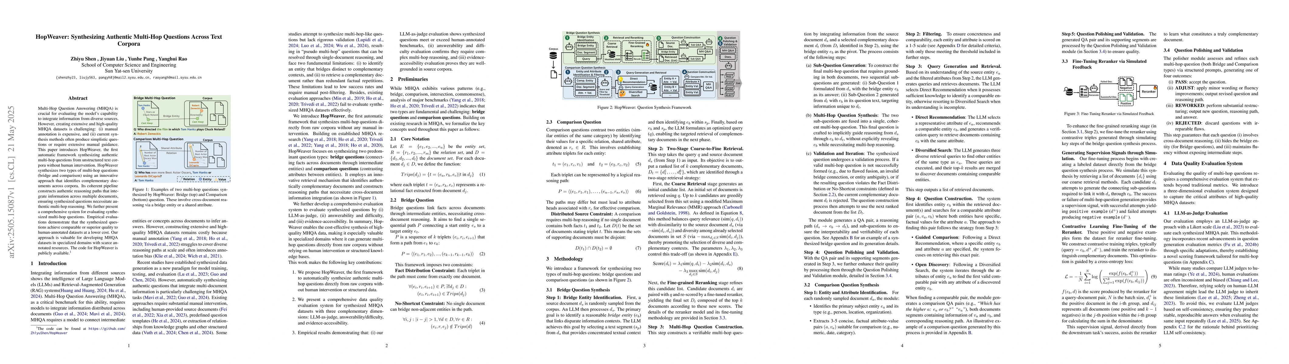 HopWeaver is an automatic framework that synthesizes multi-hop questions from unstructured text corpora by identifying complementary documents across corpora, constructing coherent reasoning paths, and ensuring questions necessitate authentic multi-hop reasoning without human intervention.