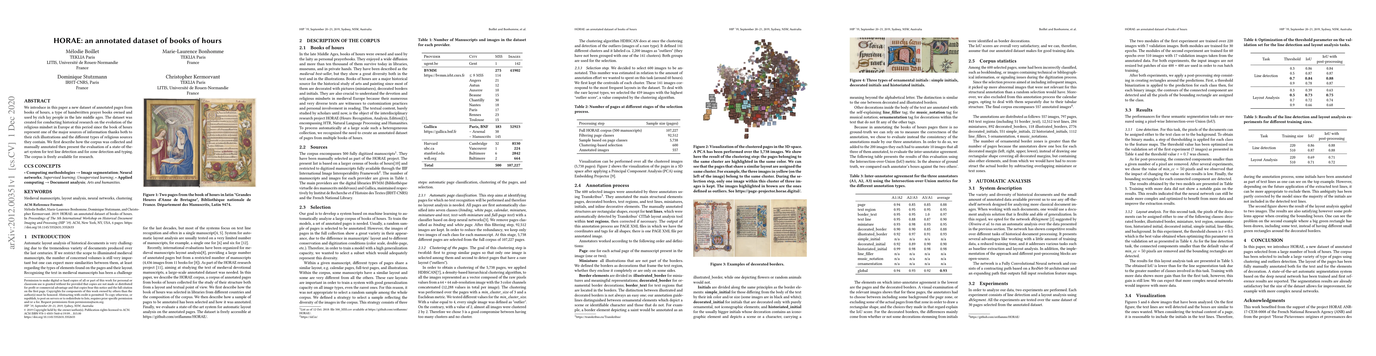 A new dataset of annotated book of hours pages has been created for historical research on European religious mindset in late middle ages. The dataset is freely available for researchers to study its potential applications in text line detection and zone typing.