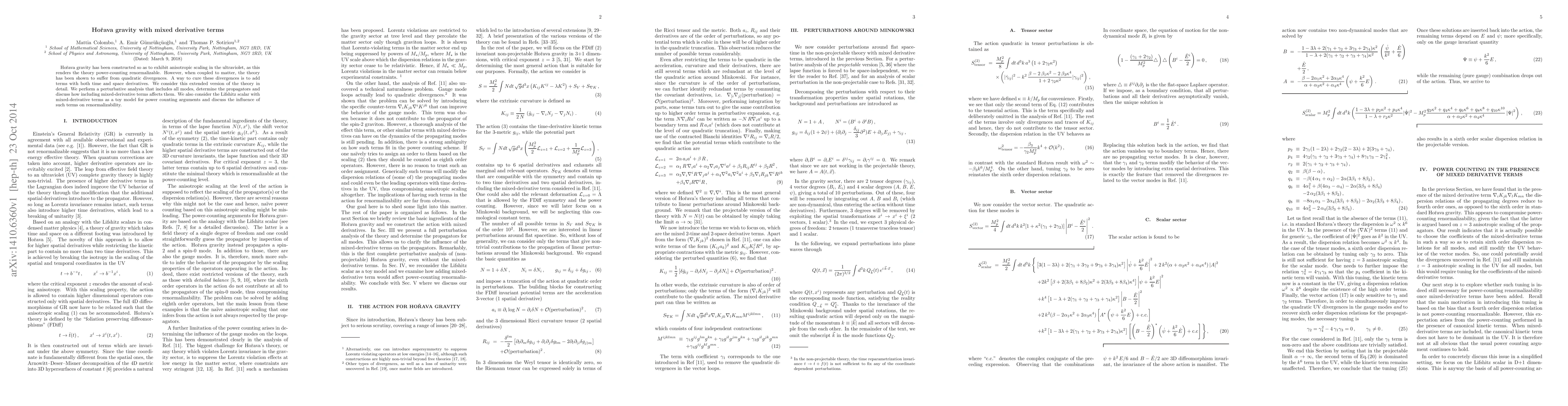 Horava gravity has been constructed so as to exhibit anisotropic scaling in the ultraviolet, as this renders the theory power-counting renormalizable. However, when coupled to matter, the theory has been shown to suffer from quadratic divergences. A way to cure these divergences is to add terms with both time and space derivatives. We consider this extended version of the theory in detail. We perform a perturbative analysis that includes all modes, determine the propagators and discuss how including mixed-derivative terms affects them. We also consider the Lifshitz scalar with mixed-derivative terms as a toy model for power counting arguments and discuss the influence of such terms on renormalizability.