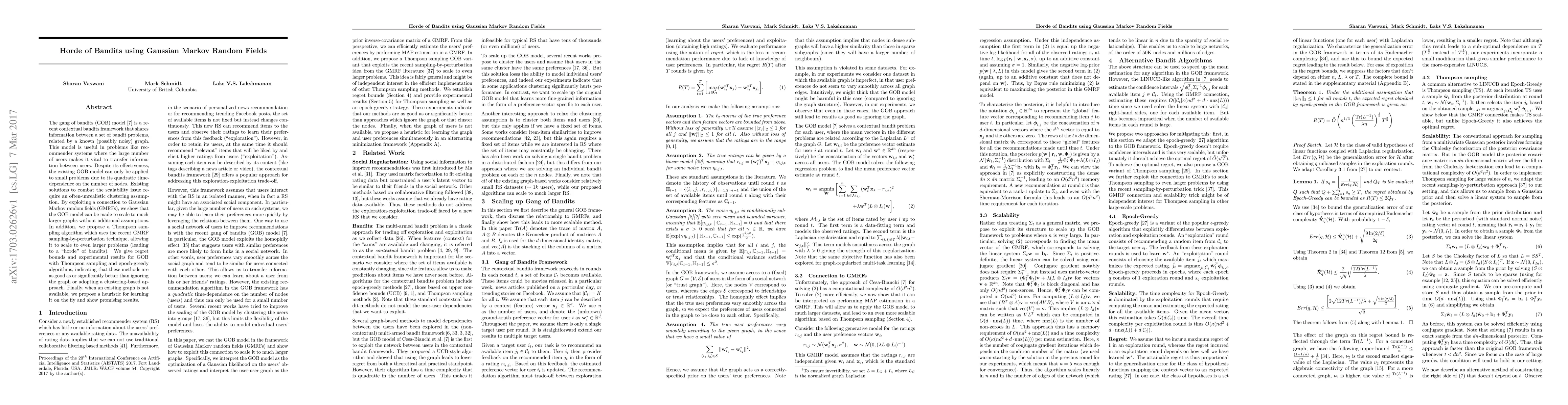 The gang of bandits (GOB) model \cite{cesa2013gang} is a recent contextual bandits framework that shares information between a set of bandit problems, related by a known (possibly noisy) graph. This model is useful in problems like recommender systems where the large number of users makes it vital to transfer information between users. Despite its effectiveness, the existing GOB model can only be applied to small problems due to its quadratic time-dependence on the number of nodes. Existing solutions to combat the scalability issue require an often-unrealistic clustering assumption. By exploiting a connection to Gaussian Markov random fields (GMRFs), we show that the GOB model can be made to scale to much larger graphs without additional assumptions. In addition, we propose a Thompson sampling algorithm which uses the recent GMRF sampling-by-perturbation technique, allowing it to scale to even larger problems (leading to a "horde" of bandits). We give regret bounds and experimental results for GOB with Thompson sampling and epoch-greedy algorithms, indicating that these methods are as good as or significantly better than ignoring the graph or adopting a clustering-based approach. Finally, when an existing graph is not available, we propose a heuristic for learning it on the fly and show promising results.