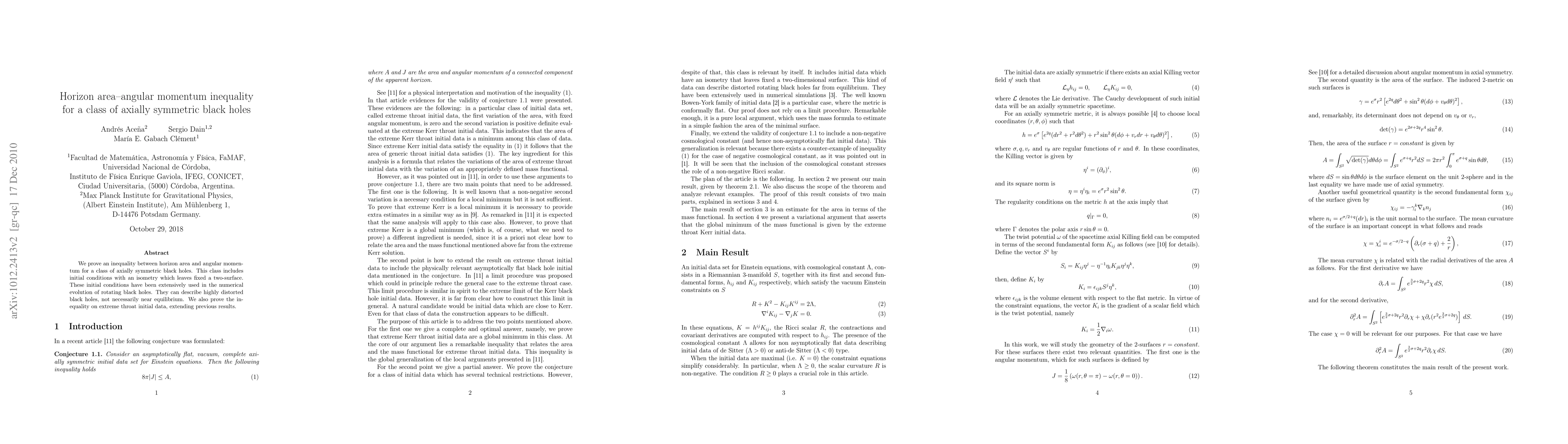 We prove an inequality between horizon area and angular momentum for a class of axially symmetric black holes. This class includes initial conditions with an isometry which leaves fixed a two-surface. These initial conditions have been extensively used in the numerical evolution of rotating black holes. They can describe highly distorted black holes, not necessarily near equilibrium. We also prove the inequality on extreme throat initial data, extending previous results.