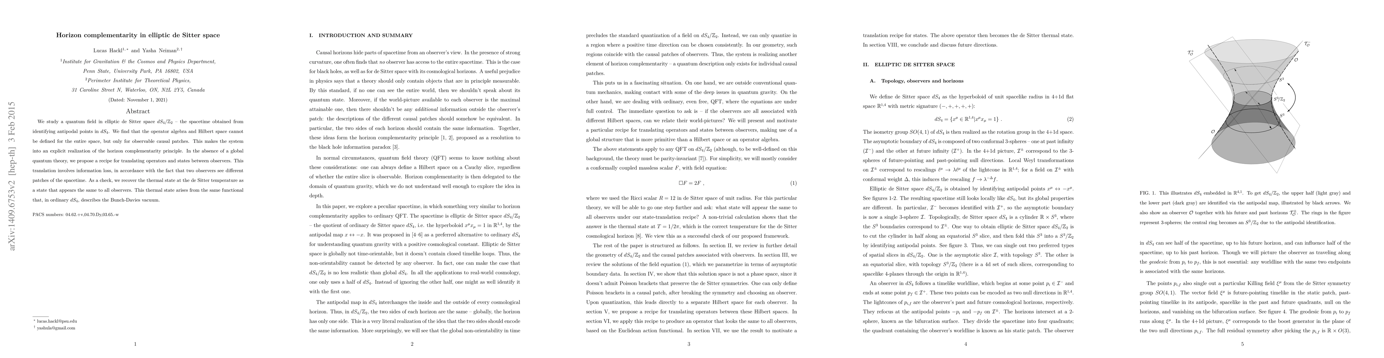 This paper explores quantum fields in elliptic de Sitter space, revealing that the operator algebra and Hilbert space are defined only for observable causal patches, exemplifying horizon complementarity. It proposes a method for translating operators between observers, highlighting information loss due to differing spacetime patches seen by each observer.