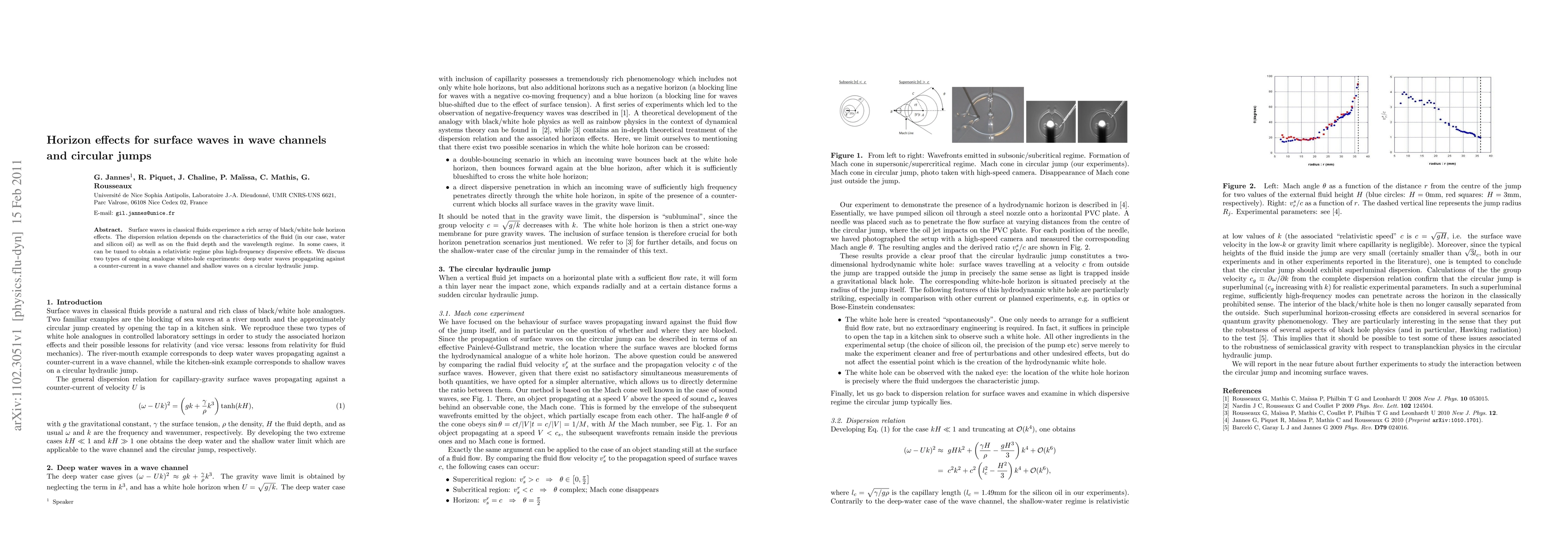 Surface waves in classical fluids experience a rich array of black/white hole horizon effects. The dispersion relation depends on the characteristics of the fluid (in our case, water and silicon oil) as well as on the fluid depth and the wavelength regime. In some cases, it can be tuned to obtain a relativistic regime plus high-frequency dispersive effects. We discuss two types of ongoing analogue white-hole experiments: deep water waves propagating against a counter-current in a wave channel and shallow waves on a circular hydraulic jump.