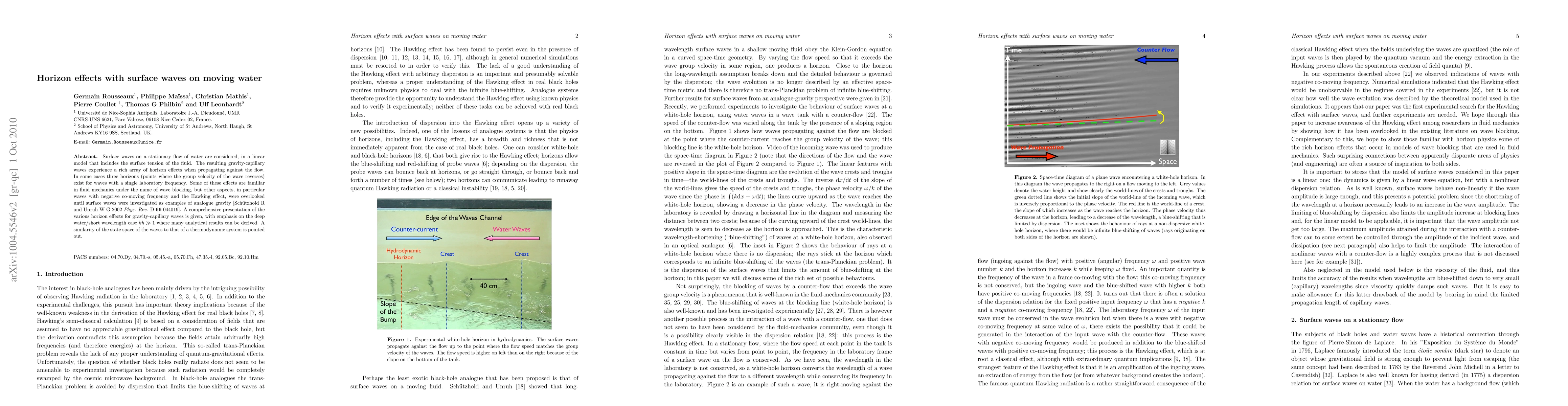 This paper investigates horizon effects in gravity-capillary waves on a moving water surface, revealing multiple horizons where wave group velocity reverses, including phenomena like wave blocking and the Hawking effect. Analytical results focus on deep water/short wavelength scenarios.