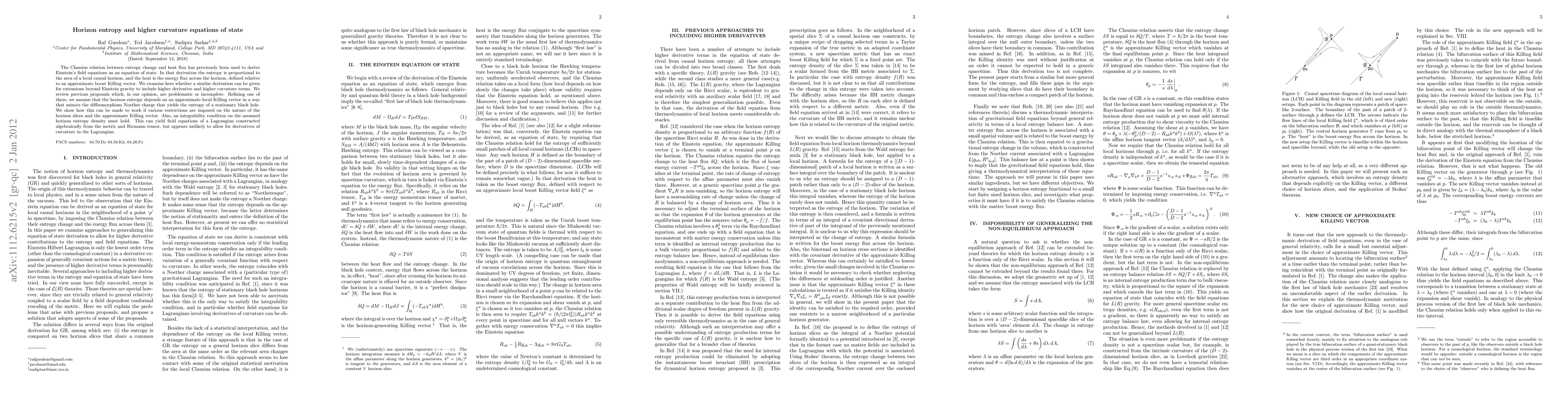 The Clausius relation between entropy change and heat flux has previously been used to derive Einstein's field equations as an equation of state. In that derivation the entropy is proportional to the area of a local causal horizon, and the heat is the energy flux across the horizon, defined relative to an approximate boost Killing vector. We examine here whether a similar derivation can be given for extensions beyond Einstein gravity to include higher derivative and higher curvature terms. We review previous proposals which, in our opinion, are problematic or incomplete. Refining one of these, we assume that the horizon entropy depends on an approximate local Killing vector in a way that mimics the diffeomorphism Noether charge that yields the entropy of a stationary black hole. We show how this can be made to work if various restrictions are imposed on the nature of the horizon slices and the approximate Killing vector. Also, an integrability condition on the assumed horizon entropy density must hold. This can yield field equations of a Lagrangian constructed algebraically from the metric and Riemann tensor, but appears unlikely to allow for derivatives of curvature in the Lagrangian.