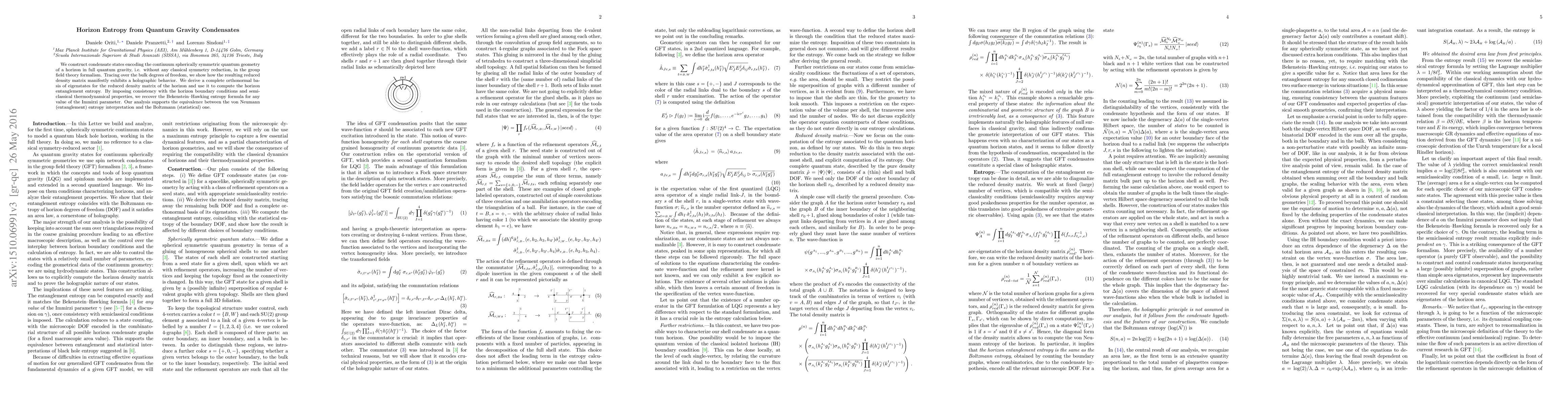 We construct condensate states encoding the continuum spherically symmetric quantum geometry of an horizon in full quantum gravity, i.e. without any classical symmetry reduction, in the group field theory formalism. Tracing over the bulk degrees of freedom, we show how the resulting reduced density matrix manifestly exhibits an holographic behavior. We derive a complete orthonormal basis of eigenstates for the reduced density matrix of the horizon and use it to compute the horizon entanglement entropy. By imposing consistency with the horizon boundary conditions and semiclassical thermodynamical properties, we recover the Bekenstein--Hawking entropy formula for any value of the Immirzi parameter. Our analysis supports the equivalence between the von Neumann (entanglement) entropy interpretation and the Boltzmann (statistical) one.