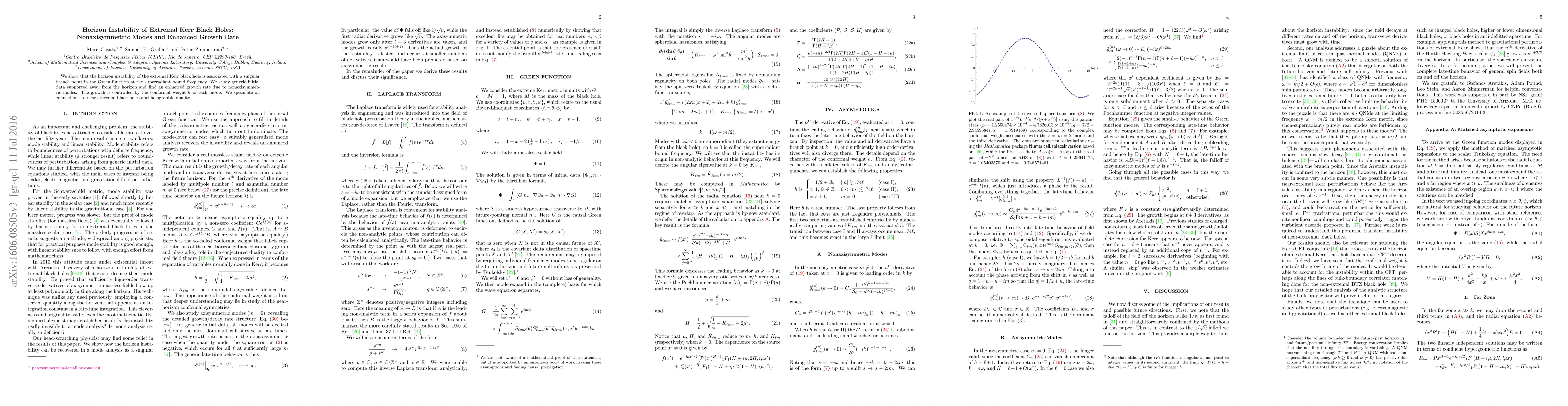 Summary: This paper explores the horizon instability of extremal Kerr black holes, revealing a singular branch point in the Green function linked to enhanced growth rates from nonaxisymmetric modes, with growth controlled by mode conformal weights, and speculates on implications for near-extremal black holes and holographic duality.