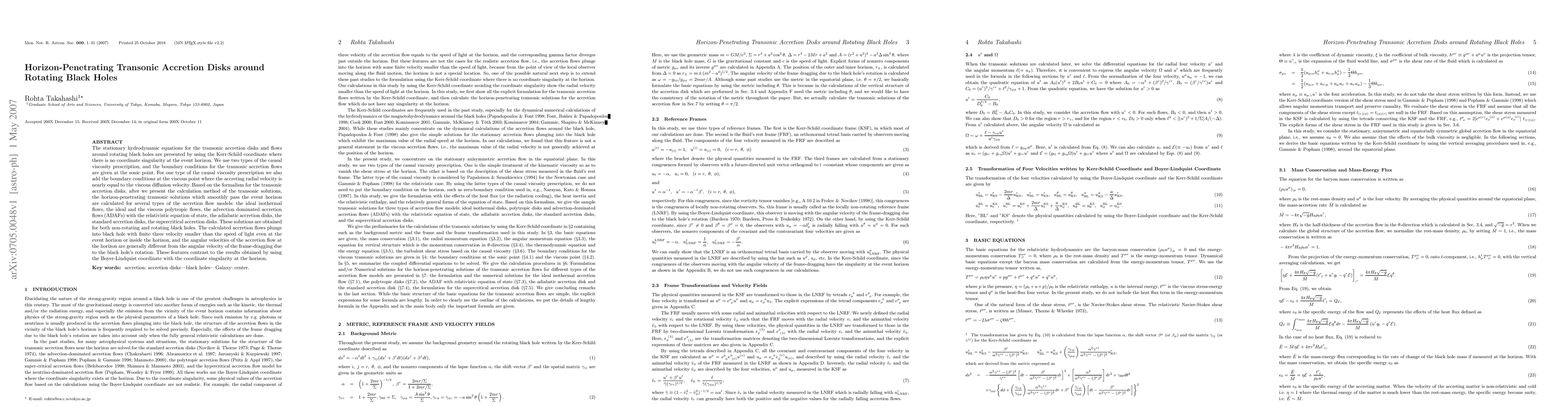 The stationary hydrodynamic equations for the transonic accretion disks and flows around rotating black holes are presented by using the Kerr-Schild coordinate where there is no coordinate singularity at the event horizon. We use two types of the causal viscosity prescription, and the boundary conditions for the transonic accretion flows are given at the sonic point. For one type of the causal viscosity prescription we also add the boundary conditions at the viscous point where the accreting radial velocity is nearly equal to the viscous diffusion velocity. Based on the formalism for the transonic accretion disks, after we present the calculation method of the transonic solutions, the horizon-penetrating transonic solutions which smoothly pass the event horizon are calculated for several types of the accretion flow models: the ideal isothermal flows, the ideal and the viscous polytropic flows, the advection dominated accretion flows (ADAFs) with the relativistic equation of state, the adiabatic accretion disks, the standard accretion disks, the supercritical accretion disks. These solutions are obtained for both non-rotating and rotating black holes. The calculated accretion flows plunge into black hole with finite three velocity smaller than the speed of light even at the event horizon or inside the horizon, and the angular velocities of the accretion flow at the horizon are generally different from the angular velocity of the frame-dragging due to the black hole's rotation. These features contrast to the results obtained by using the Boyer-Lindquist coordinate with the coordinate singularity at the horizon.