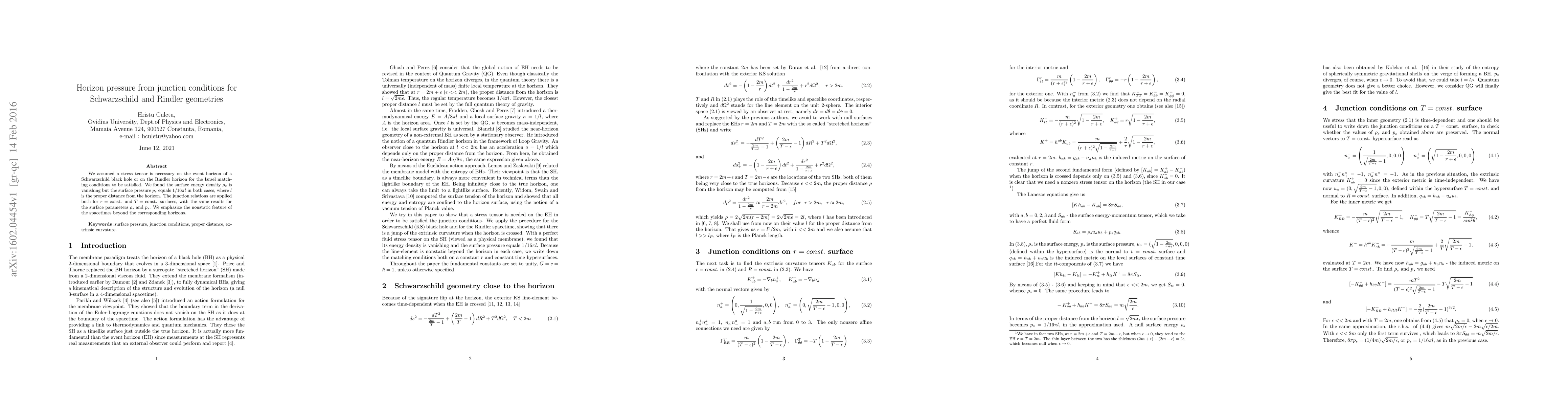 This paper investigates the junction conditions for Schwarzschild and Rindler geometries, finding that while the surface energy density $\rho_{s}$ vanishes, the surface pressure $p_{s}$ equals $1/16\pi l$ in both cases, where $l$ is the proper distance from the horizon. The nonstatic nature of spacetimes beyond these horizons is highlighted.