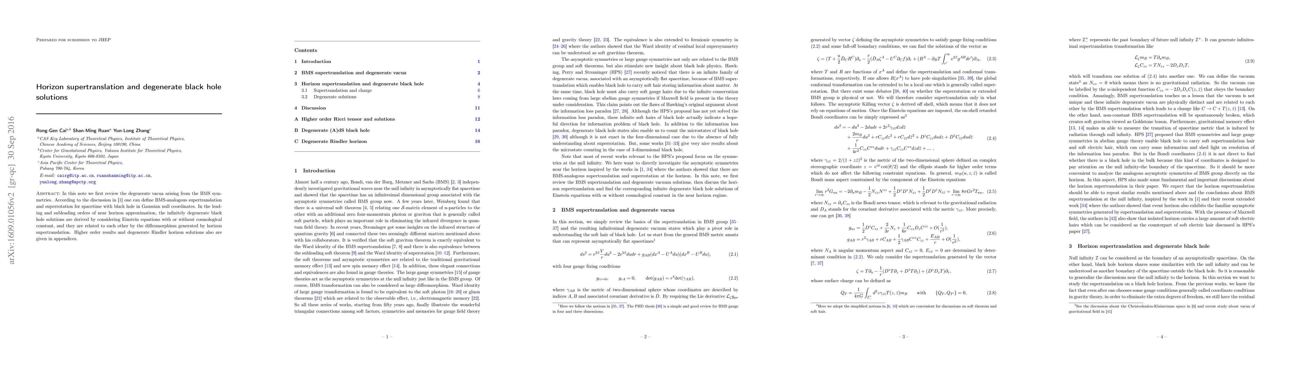 This paper explores degenerate black hole solutions in the context of BMS symmetries, deriving infinitely degenerate solutions in the near-horizon approximation related by horizon supertranslation, and includes higher-order results and degenerate Rindler horizons in appendices.