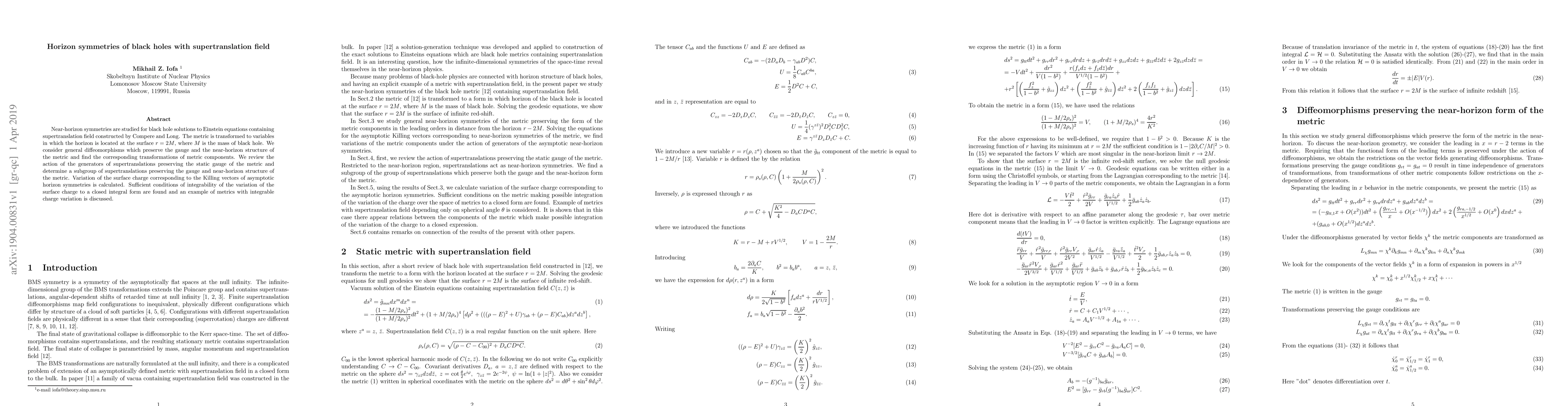 This paper investigates near-horizon symmetries of black holes with a supertranslation field, transforming the metric to highlight the horizon at $r=2M$. It identifies transformations preserving the gauge and near-horizon structure, determines the subgroup of supertranslations that maintain these properties, and examines the variation of surface charge corresponding to asymptotic horizon symmetries.