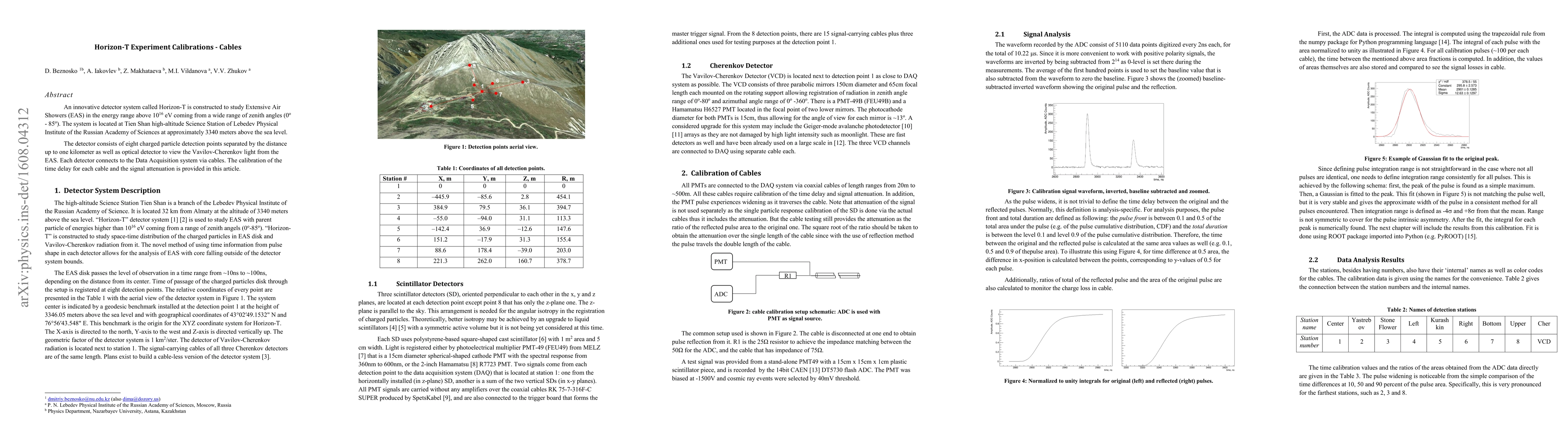 An innovative detector system called Horizon-T is constructed to study Extensive Air Showers (EAS) in the energy range above 10^16 eV coming from a wide range of zenith angles (0o - 85o). The system is located at Tien Shan high-altitude Science Station of Lebedev Physical Institute of the Russian Academy of Sciences at approximately 3340 meters above the sea level. The detector consists of eight charged particle detection points separated by the distance up to one kilometer as well as optical detector to view the Vavilov-Cherenkov light from the EAS. Each detector connects to the Data Acquisition system via cables. The calibration of the time delay for each cable and the signal attenuation is provided in this article.
