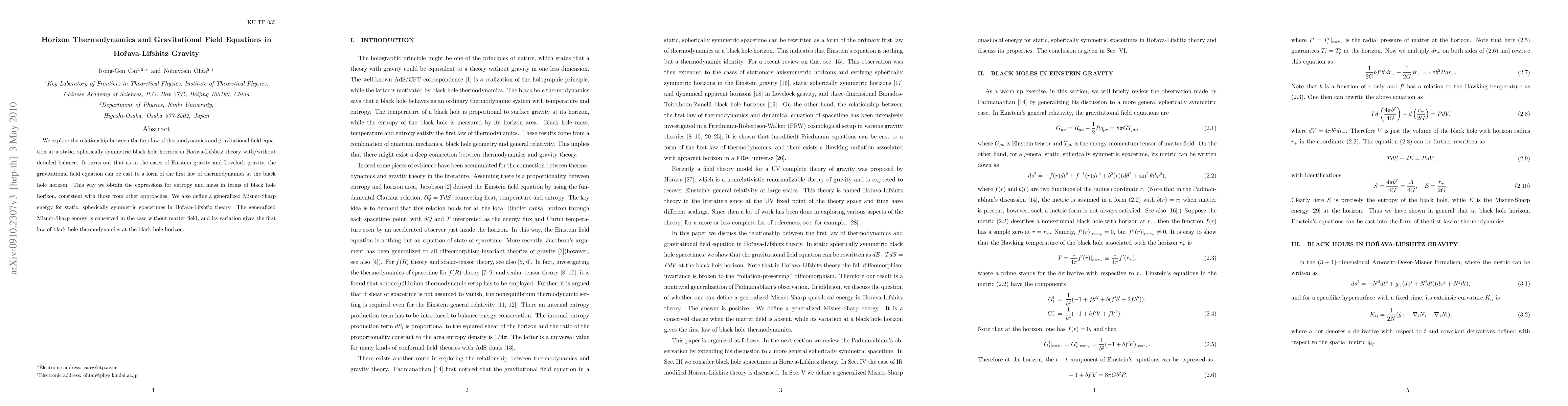 This paper investigates the connection between thermodynamics and gravitational field equations in Horava-Lifshitz gravity, showing that the gravitational field equation can be expressed as the first law of thermodynamics at a black hole horizon. It also defines a generalized Misner-Sharp energy, which is conserved without matter fields and aligns with the first law of black hole thermodynamics.